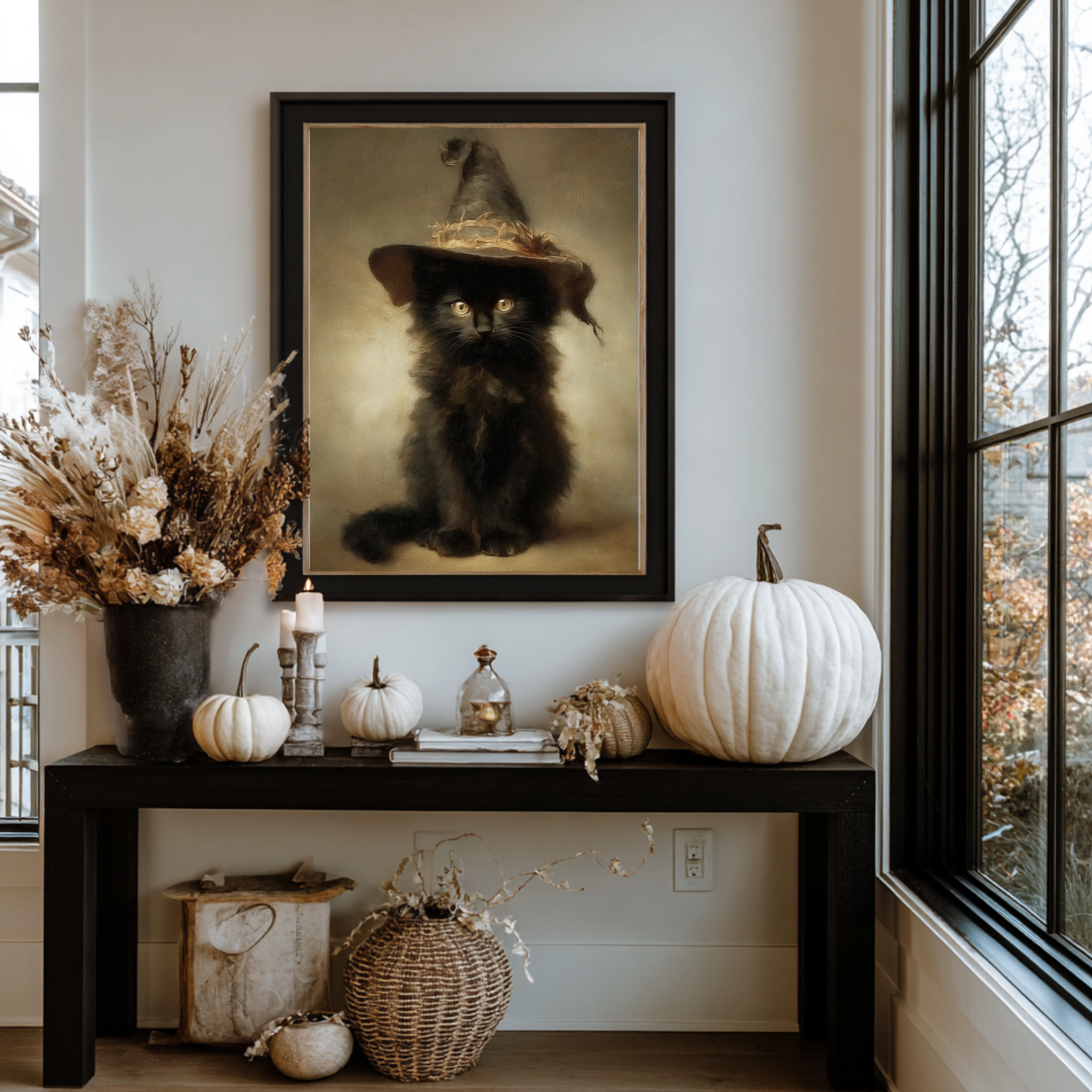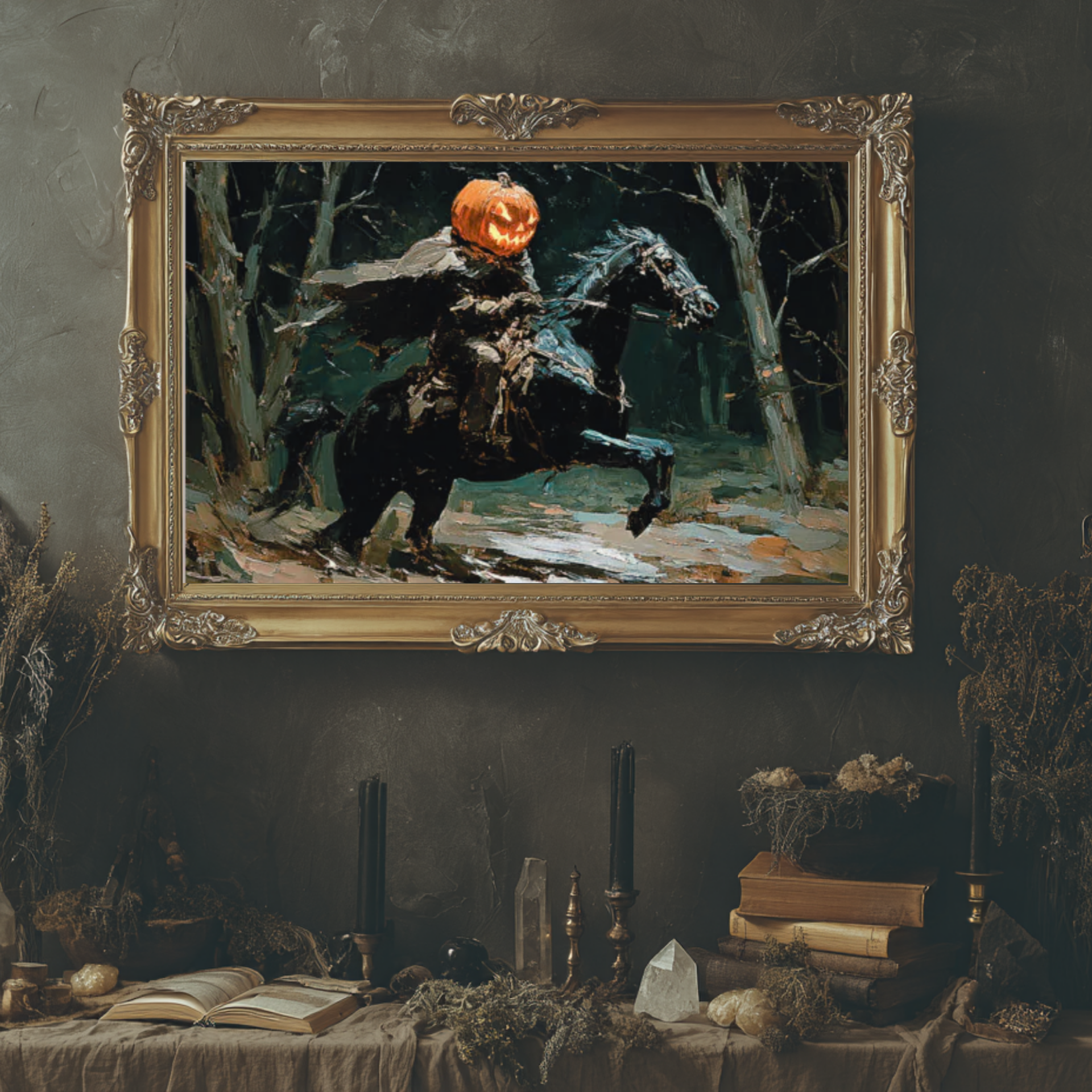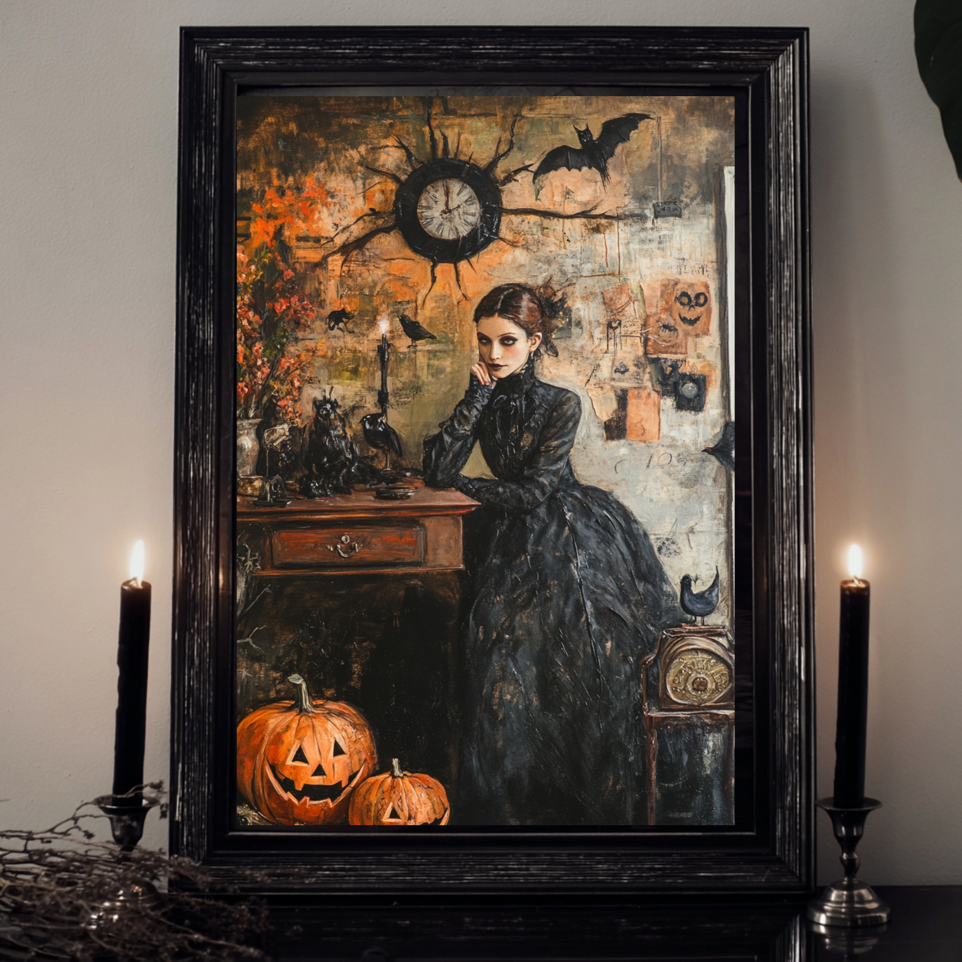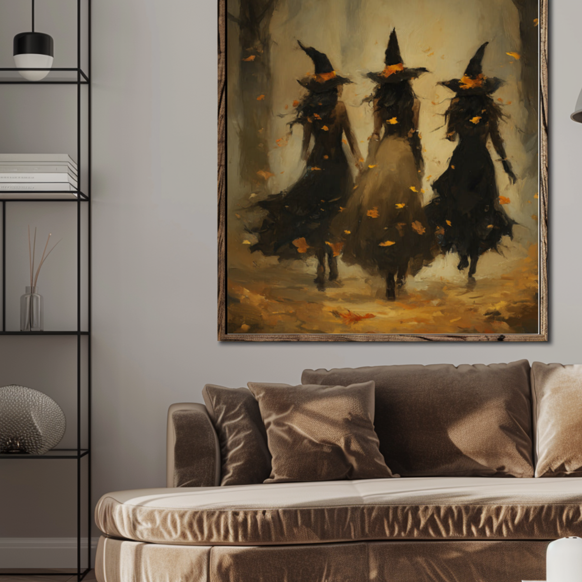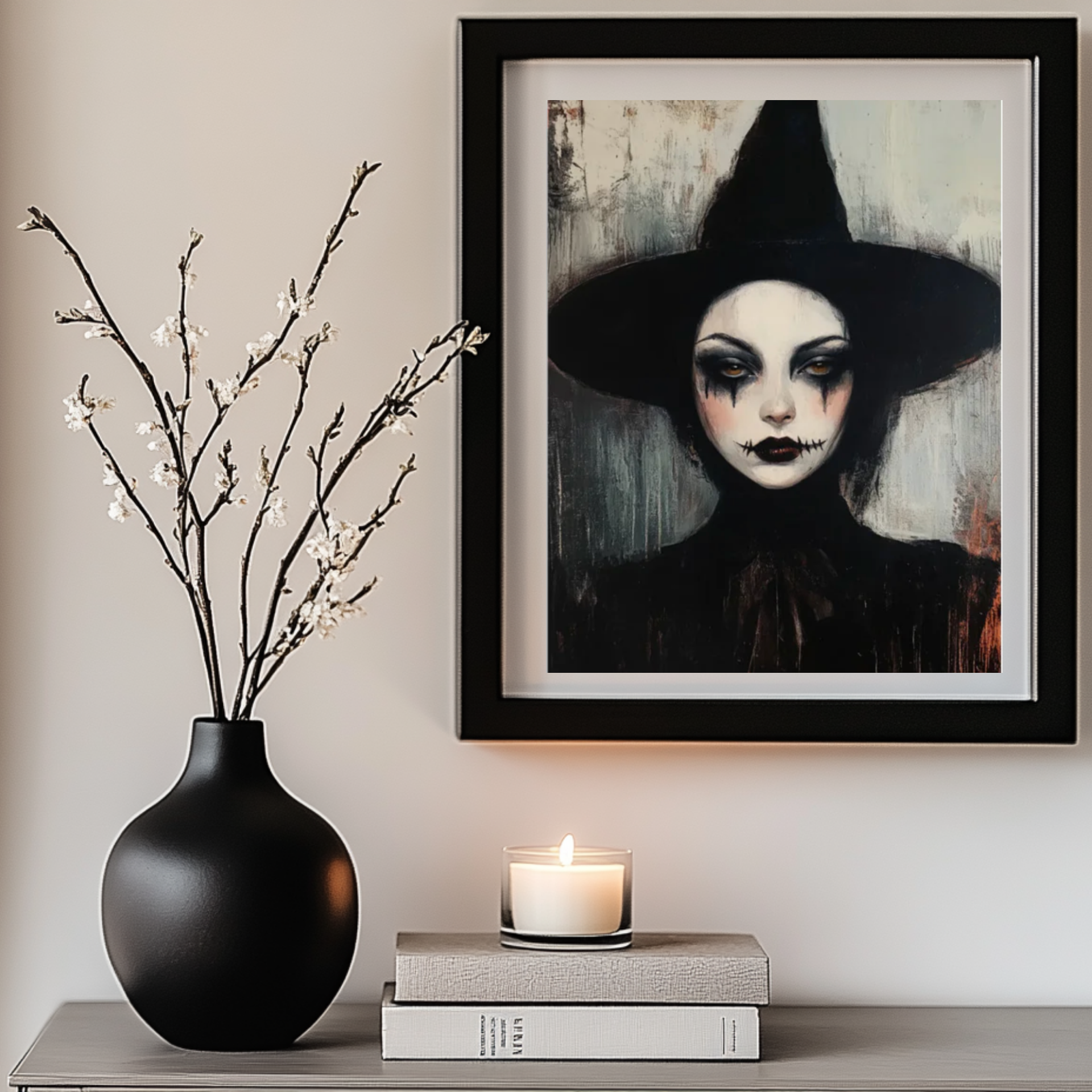 Pro Tip: Add framed Halloween quotes or DIY spell book props for bookshelf styling.