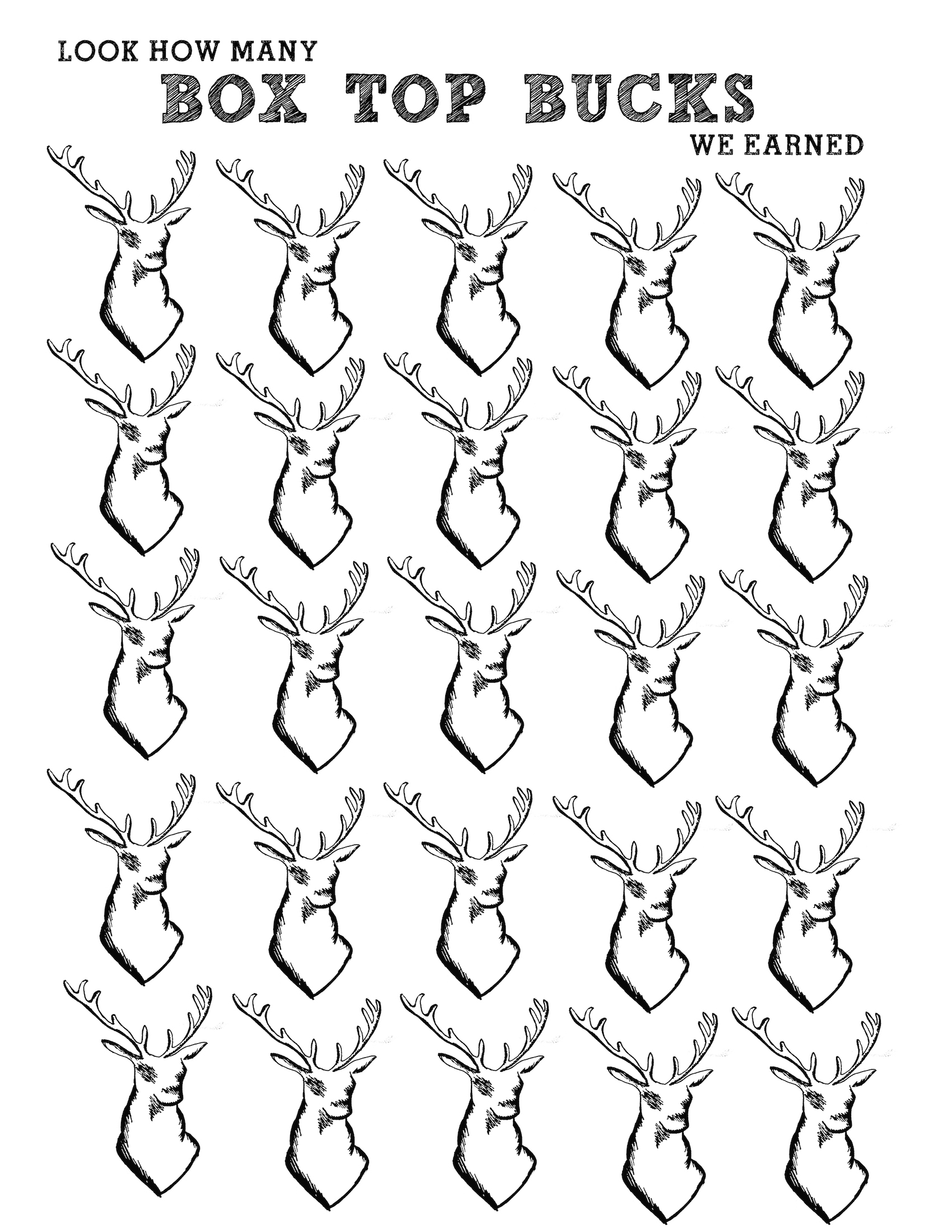 Simply print them on regular paper or cardstock (8.5 x 11 inch). Fold the envelope page in half and tape or glue the sides. Mark a buck off your chart with a marker, crayon or sticker each time you save 10 boxtops.