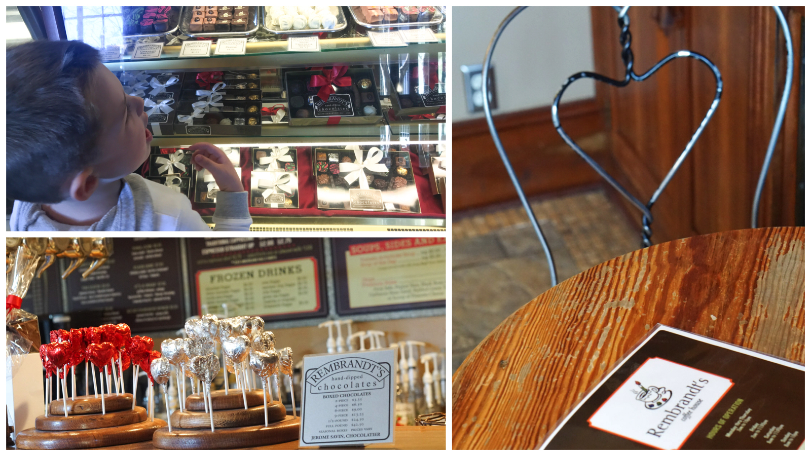 The first stop on our list was at Rembrandt’s Coffee Shop, thankfully! Because coffee is life if you’re a mom, right? Rembrandt’s not only whips up delicious coffee drinks they make their own chocolate too. My wide eyed child stared in wonder at the case full of chocolate treats and couldn’t wait to sample the goods.