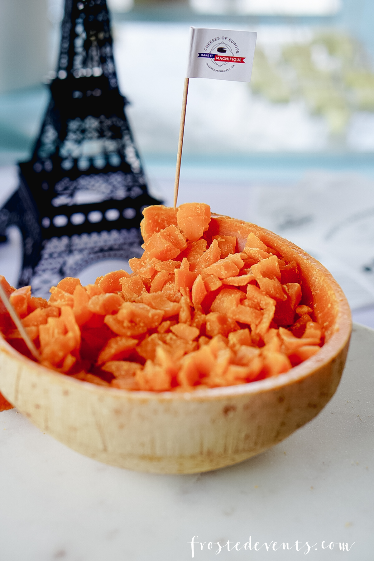 We started our cheese tour with Mimolette, a brilliant orange cheese that is quite eye catching and equally tasty. Mimolette has a sharp, nutty taste with a hint of sweetness. It pairs well with a rustic red wine or ale.