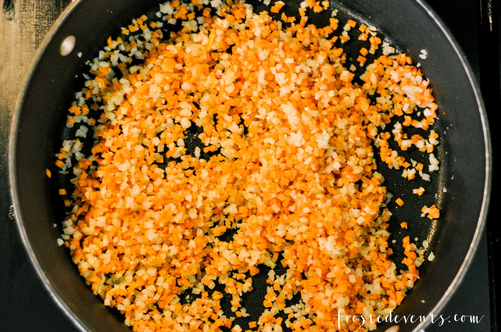 - Heat a tablespoon of coconut oil (or olive oil) in a saute pan. Add package of riced veggies and cook for 5 to 7 minutes.