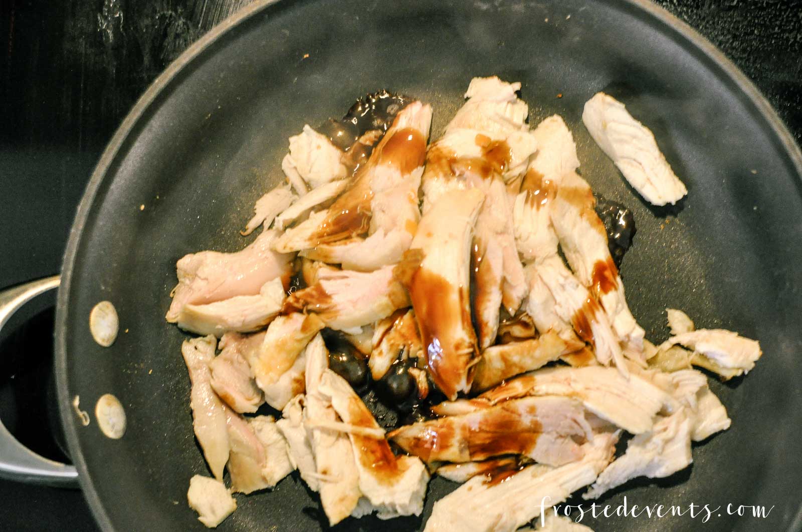 I pull the chicken and toss in a pan to sear it a little bit, then add a couple of tablespoons of teriyaki sauce to seal in the flavor.