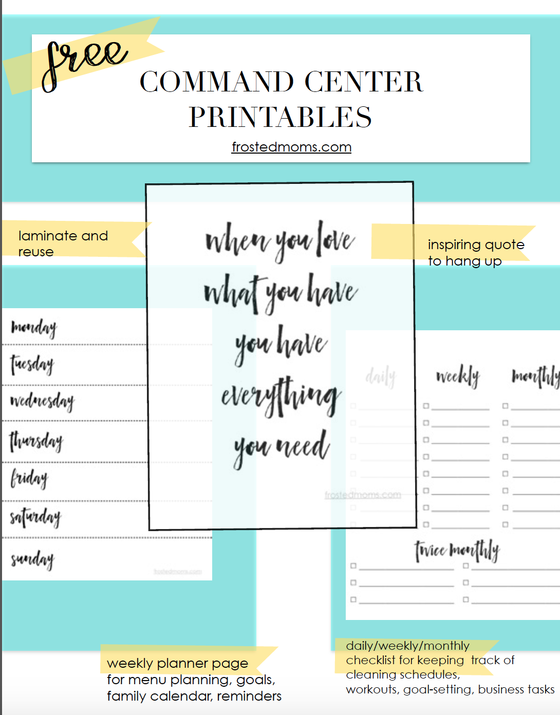 I designed these free printable planner pages to post up at my command station. Print a bunch, or better yet, laminate them and use again and again.
