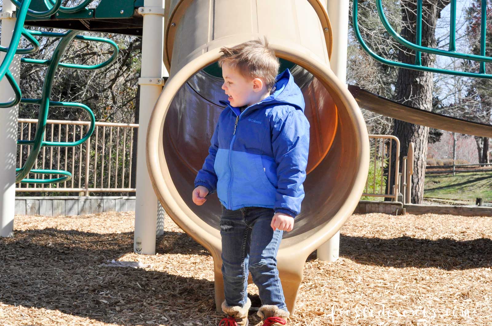 Thinking back on my old playground days it’s sweet to relive memories of my own childhood as I watch my son in action. Somehow I think you never really outgrow the happy feeling you get when you push your feet off the ground and feel the wind hit your face, swinging higher and higher. Or the whoosh of sliding through a tunnel. It’s just amplified, a million times sweeter when you see that happiness radiate from your child.