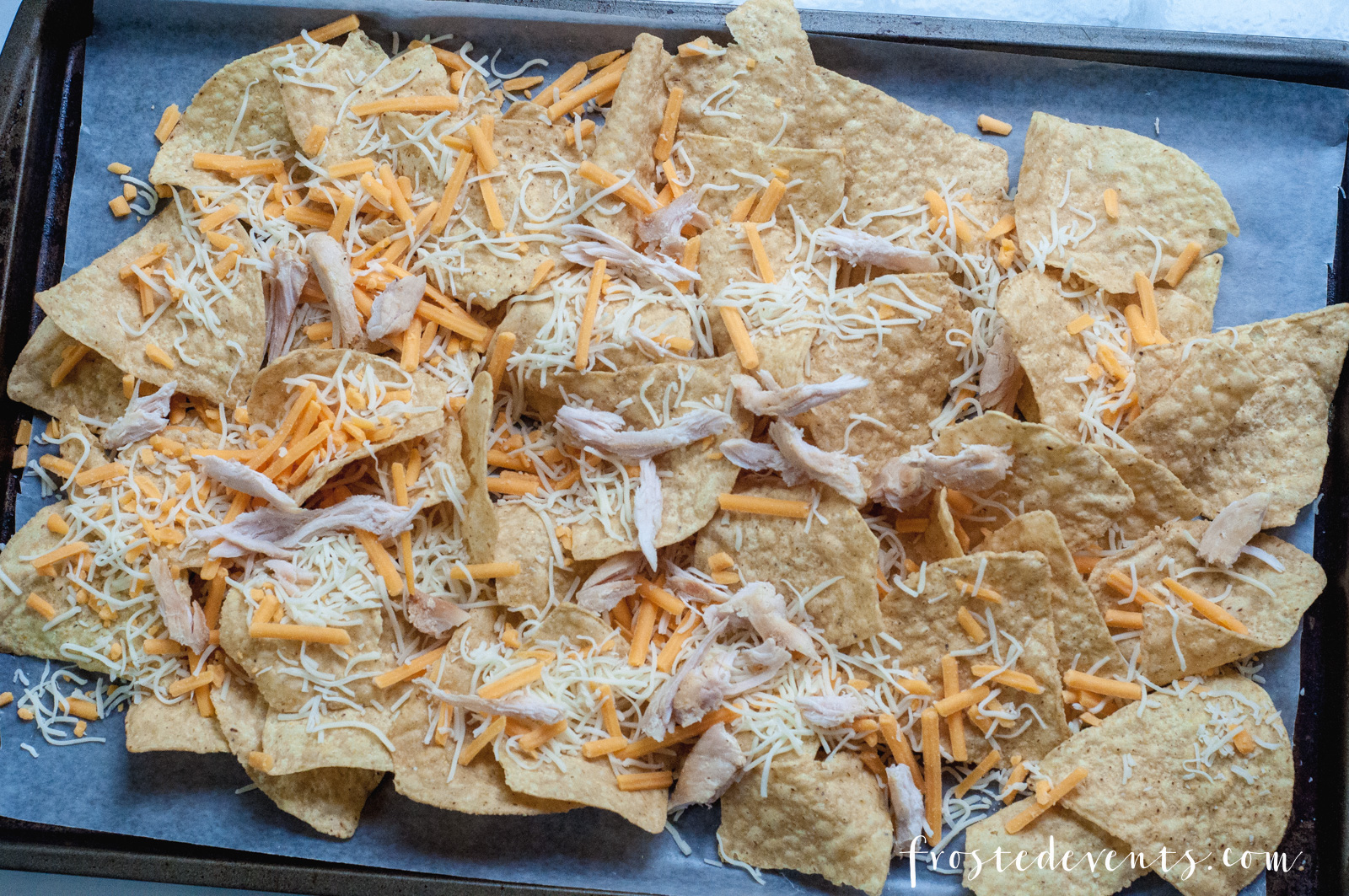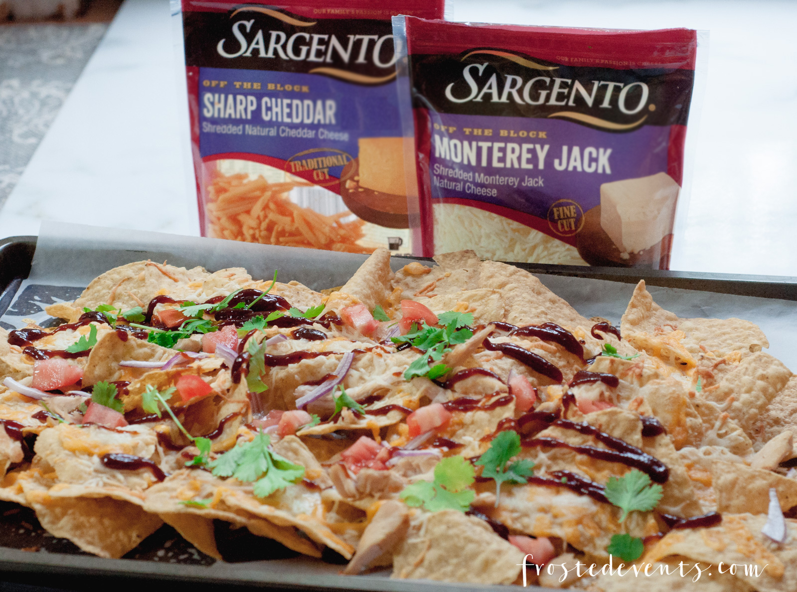 I use a blend of shredded cheddar and monterey jack to give my nachos a nice blend of flavors. Pop in the oven to melt the cheese and chicken. . Pull them out and top with barbecue sauce, red onion, cilantro and diced tomato. Serve up with a side of sour cream and watch them disappear.