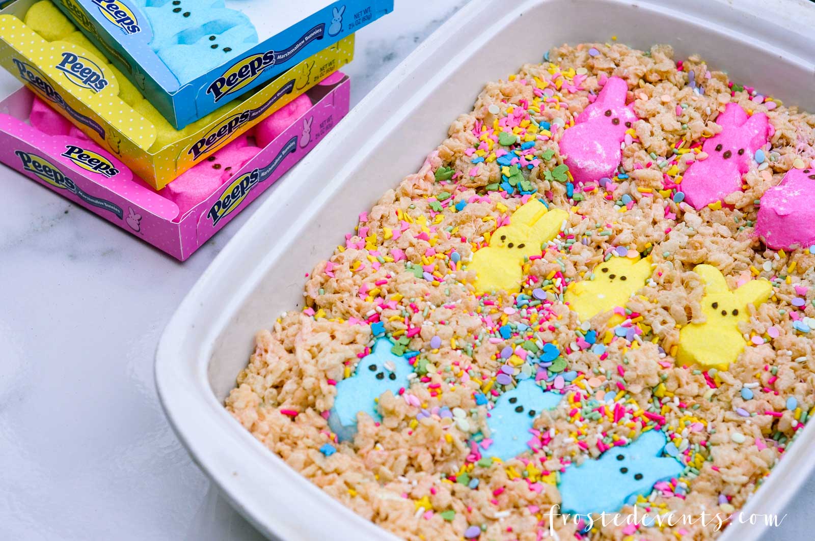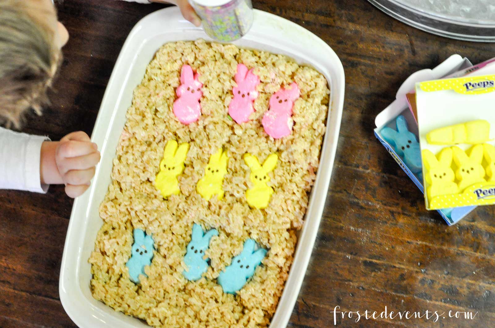 The only difference is for these treats your gonna make a little space for the peeps when you’re pressing the rice krispies into your pan. And then you just pour on the sprinkles. Lots and lots and lots of sprinkles!