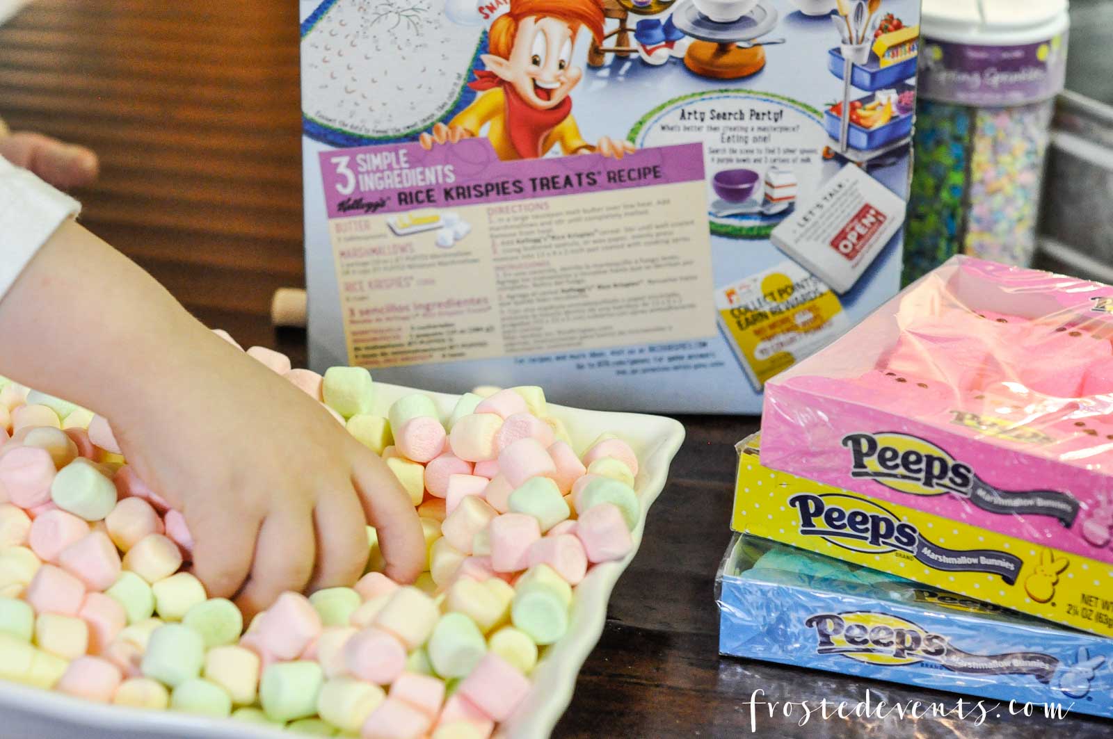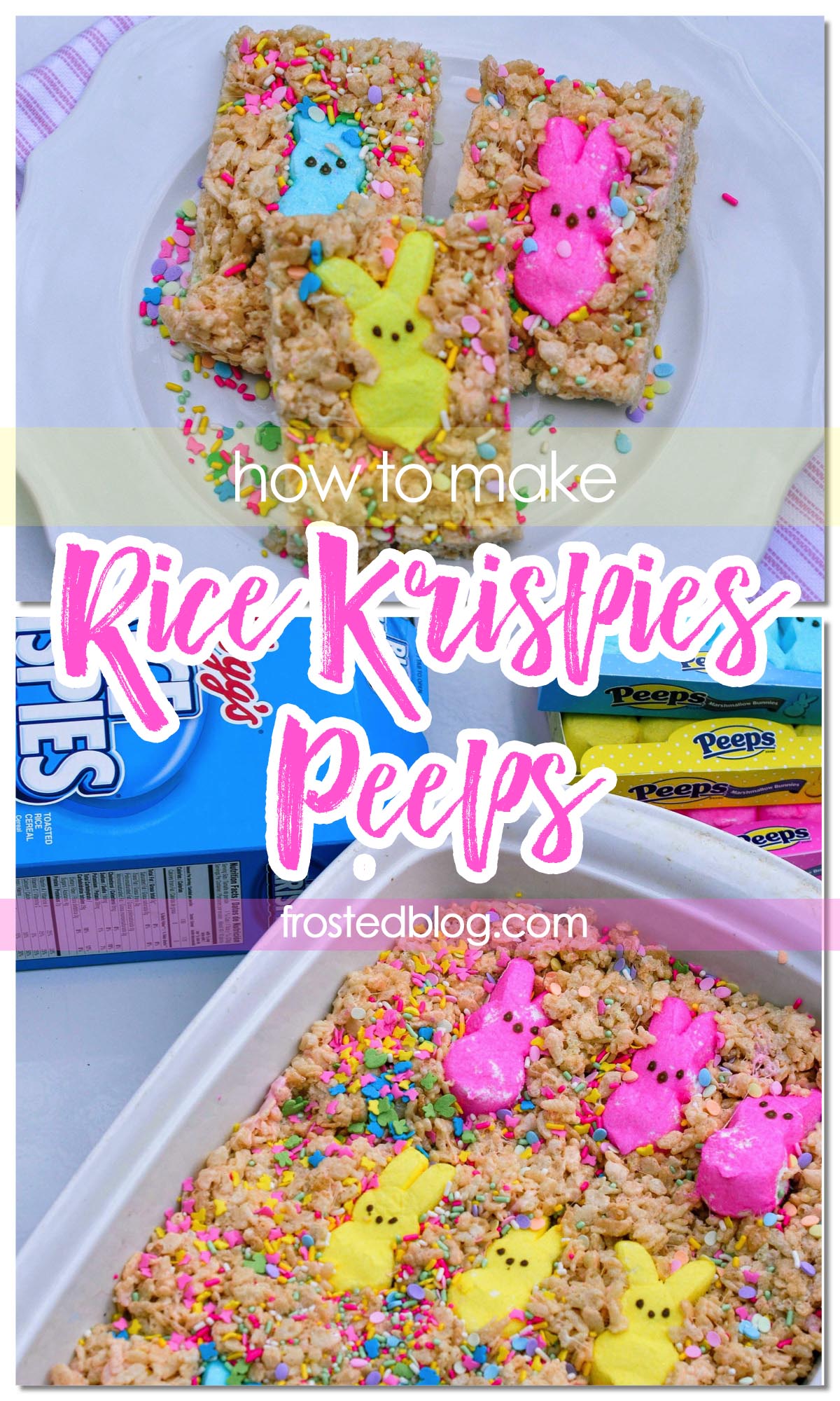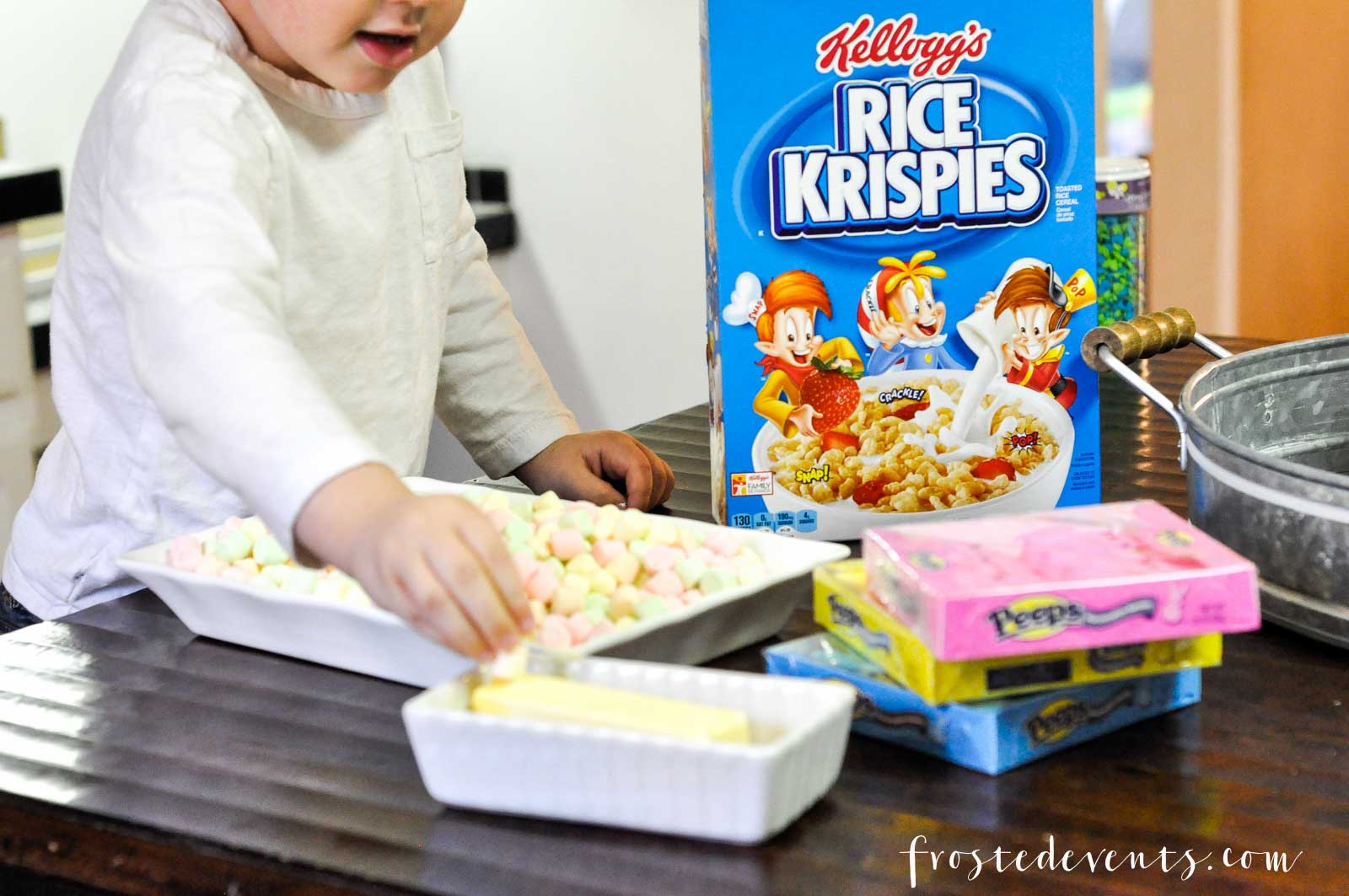 You only need a few things to make these treats. Peeps, a box of Rice Krispies, marshmallows, butter and sprinkles. Chances are you’ve made Rice Krispies Treats before. We make them allll the time!