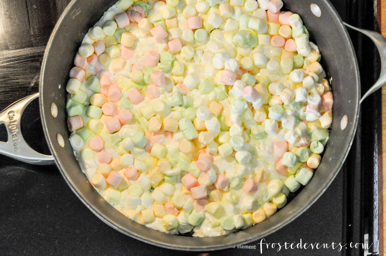 - In large saucepan melt butter over low heat. Add marshmallows and stir until completely melted. Remove from heat.