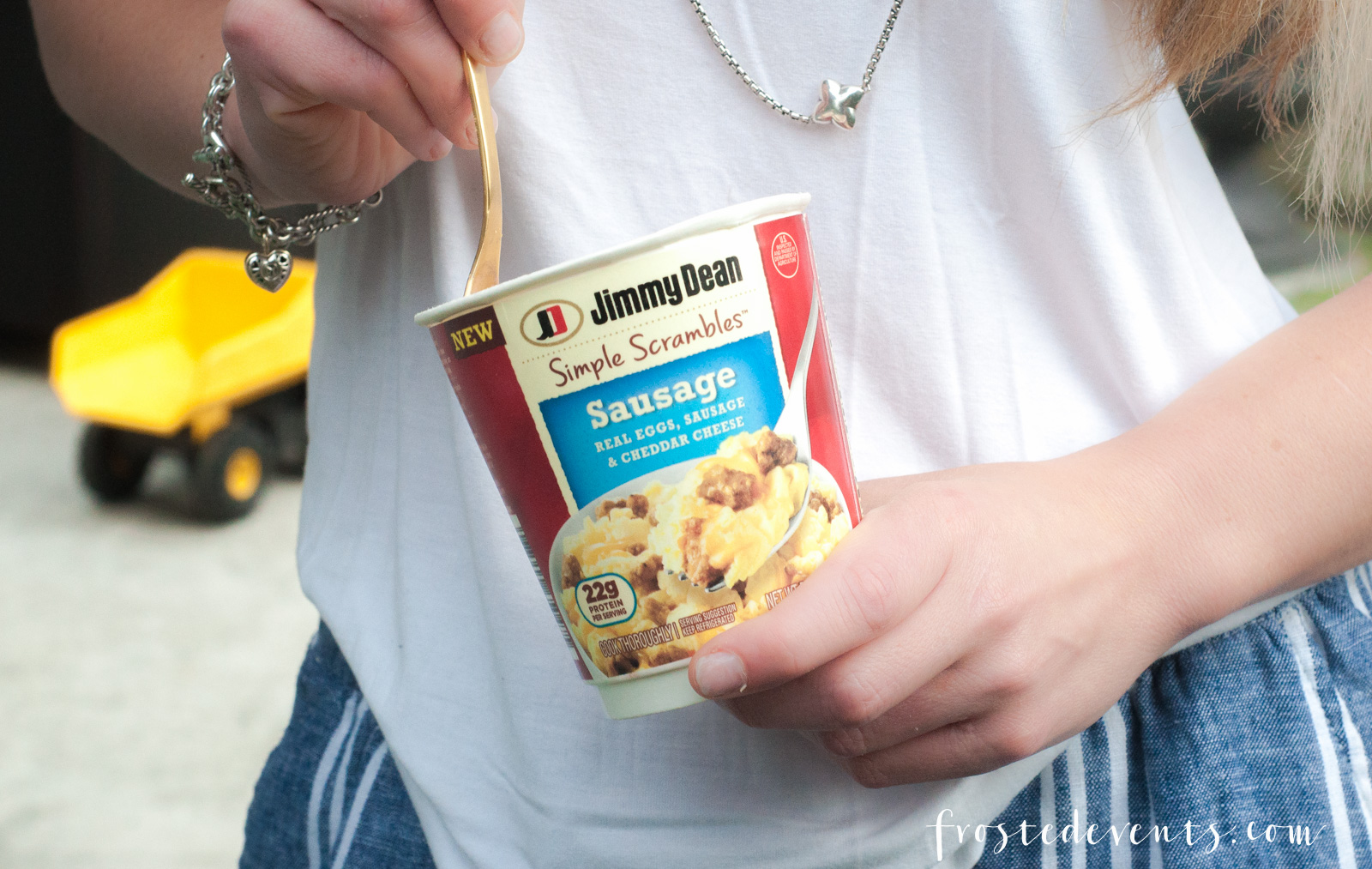 Making Jimmy Dean Simple Scrambles literally takes a few minutes. Inside each cup you’ll find 2 Pre-Beaten eggs and a separate ouch of sausage and cheese.