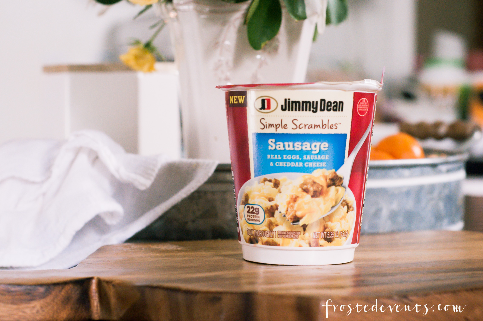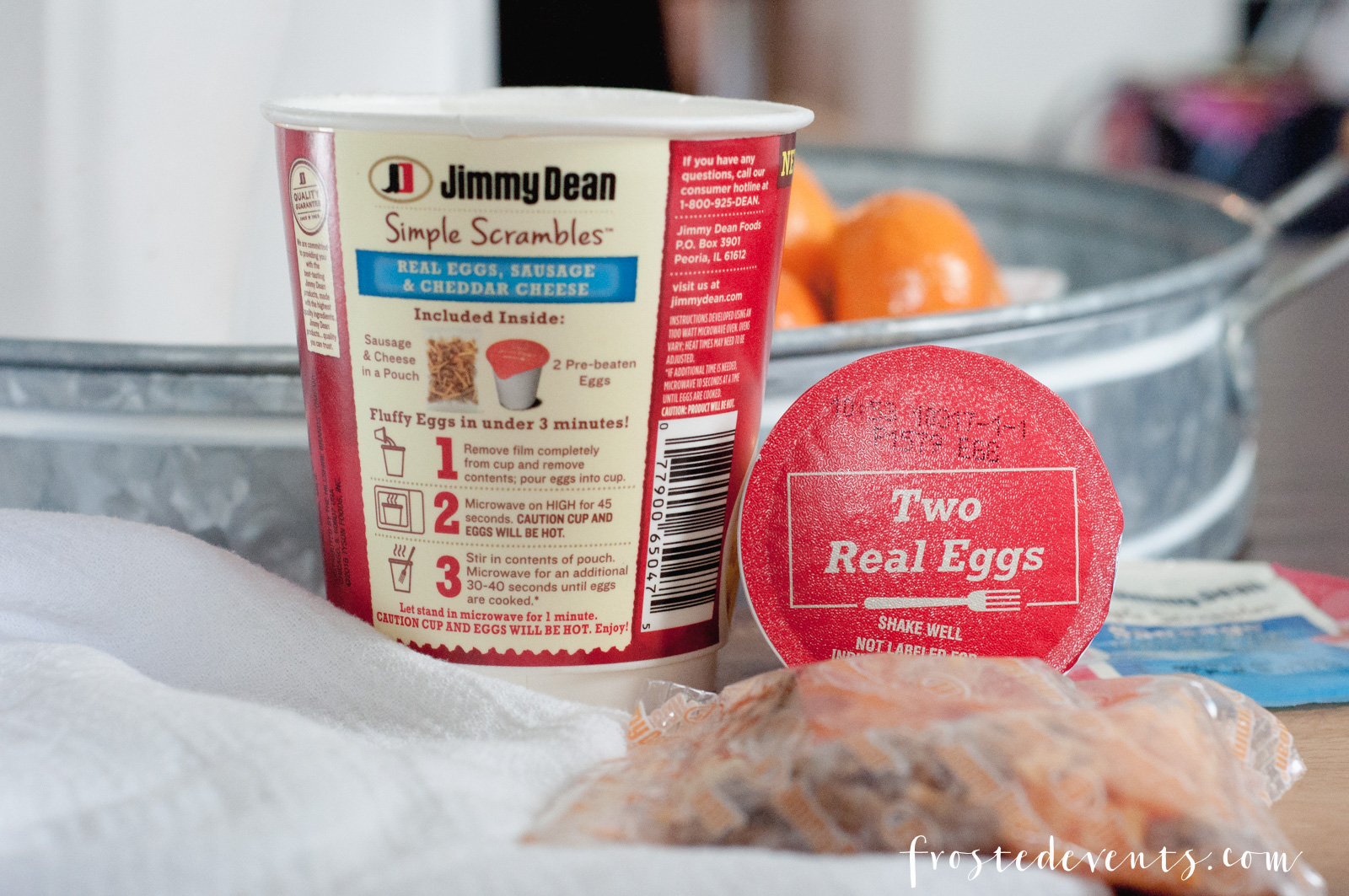 Making Jimmy Dean Simple Scrambles literally takes a few minutes. Inside each cup you’ll find 2 Pre-Beaten eggs and a separate ouch of sausage and cheese.