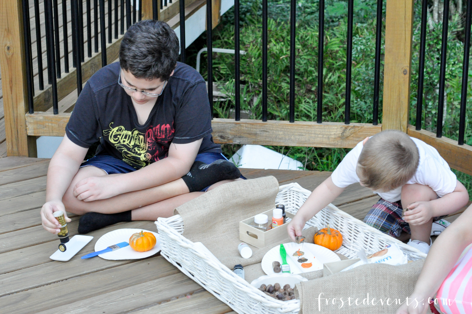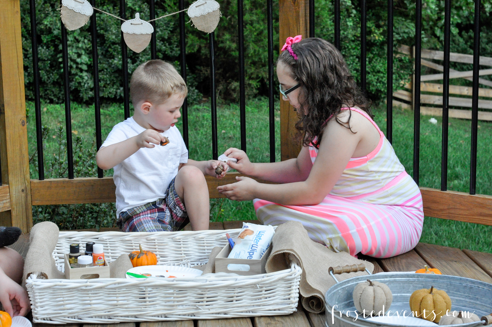 My son is a nature lover and all about exploring the great outdoors. He’s constantly on the lookout for cool rocks, big sticks and bugs of all sorts. Currently, he’s into collecting acorns and we have amassed a pile of them in a bowl on the kitchen table. A pretty picture of painted acorns on Pinterest inspired me to throw a painting party and get the kids together to decorate pumpkins and acorns.