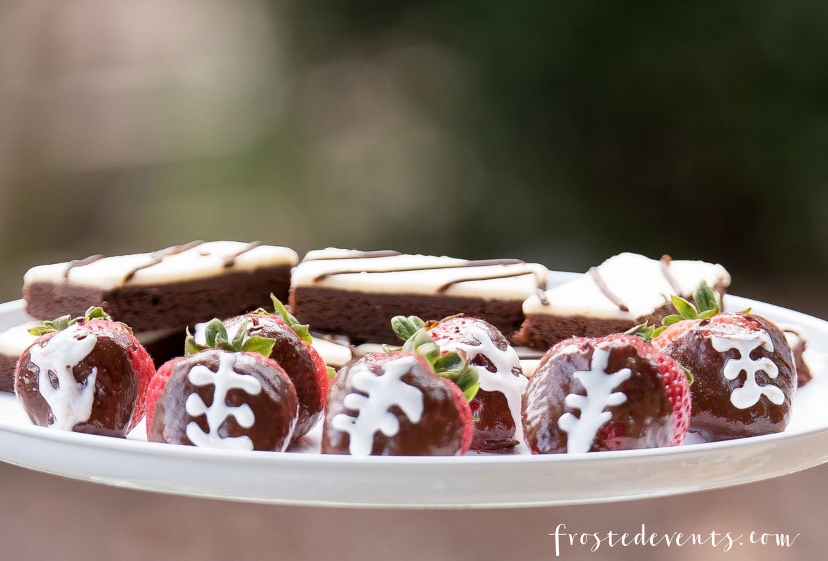 Need a few good nibbles to keep your game day crowd going? Since our party kicked off earlier in the afternoon, I went with brunch bites that were tasty and easy to pull together. Chicken &waffles, veggies and a savory dip, and of course some sweet treats for the fourth quarter. Black tie brownies and chocolate dipped strawberries for the W-I-N!