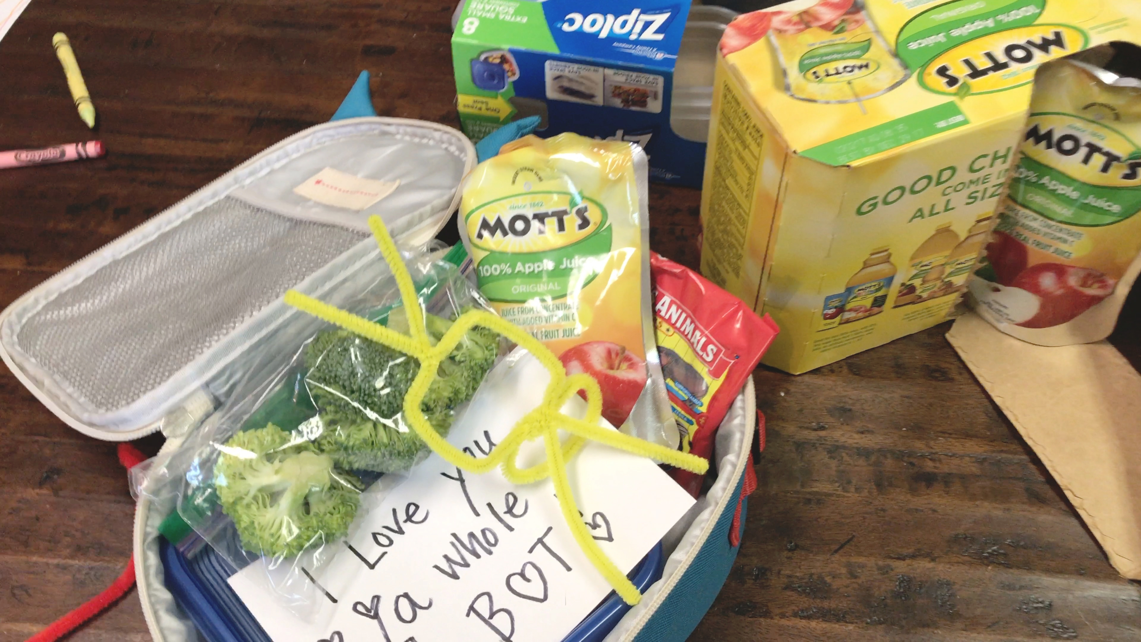 Pizza is a universal kid favorite and this one is super easy to make. Spread pizza sauce over a piece of naan bread, add cheese and your favorite toppings and pop in the oven just long enough to melt the cheese. I added a Mott’s 100% Apple Juice Pouch to our lunch box. They taste great and they come in apple, apple white grape, apple mango, and apple cherry flavors . Add a ZIPLOC® brand bag of broccoli and a small container of ranch, animal crackers and a bottle of water and lunch is done! I love to make Brady’s lunches a little more special by adding a sweet note. I doodle out a cute message to him in the morning and stick it in his lunch with an easy-to-make pipe cleaner shape. It’s a simple, crafty way to send him off with something cute and he loves it! He even makes me a cute message too sometimes.