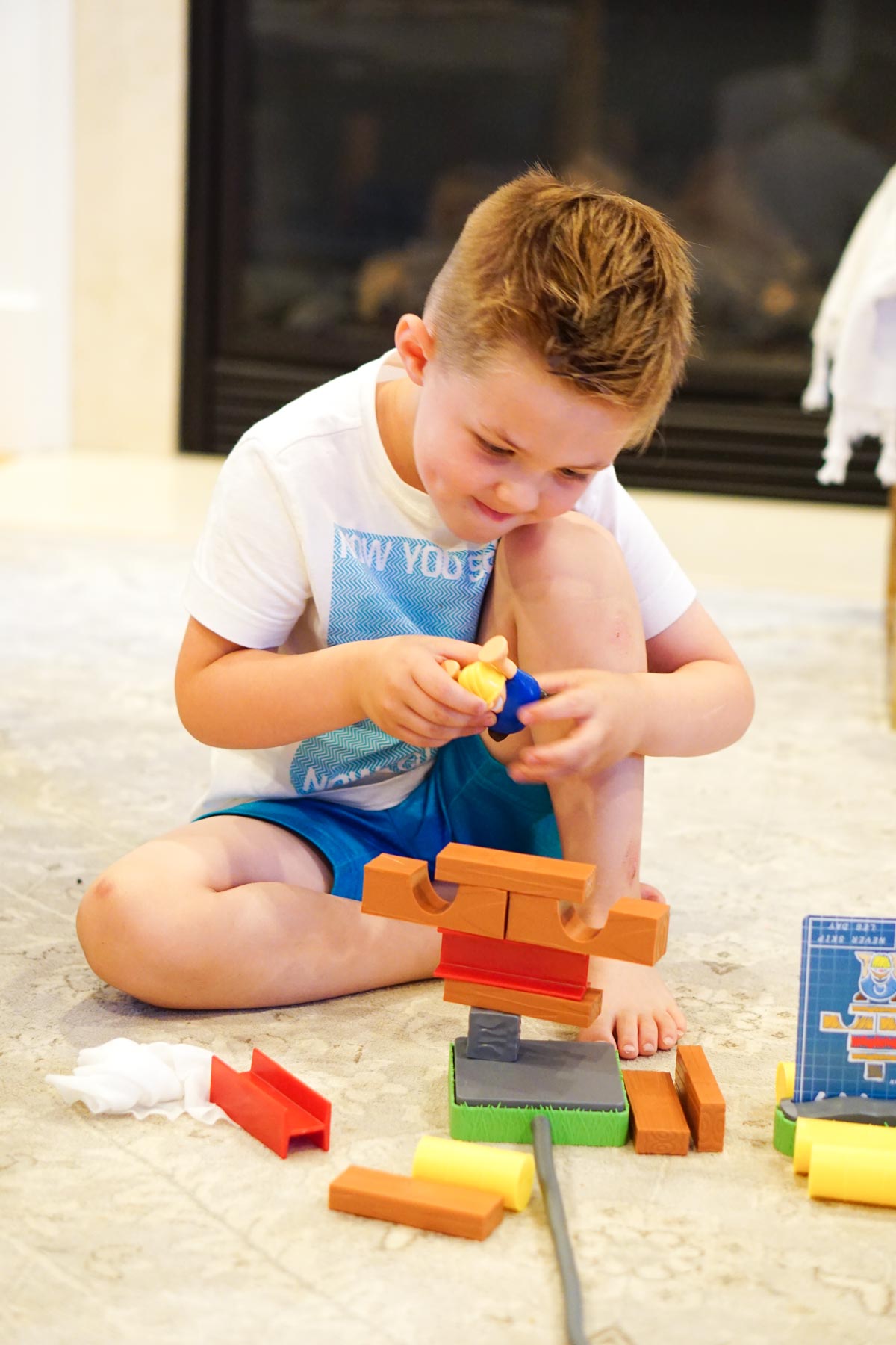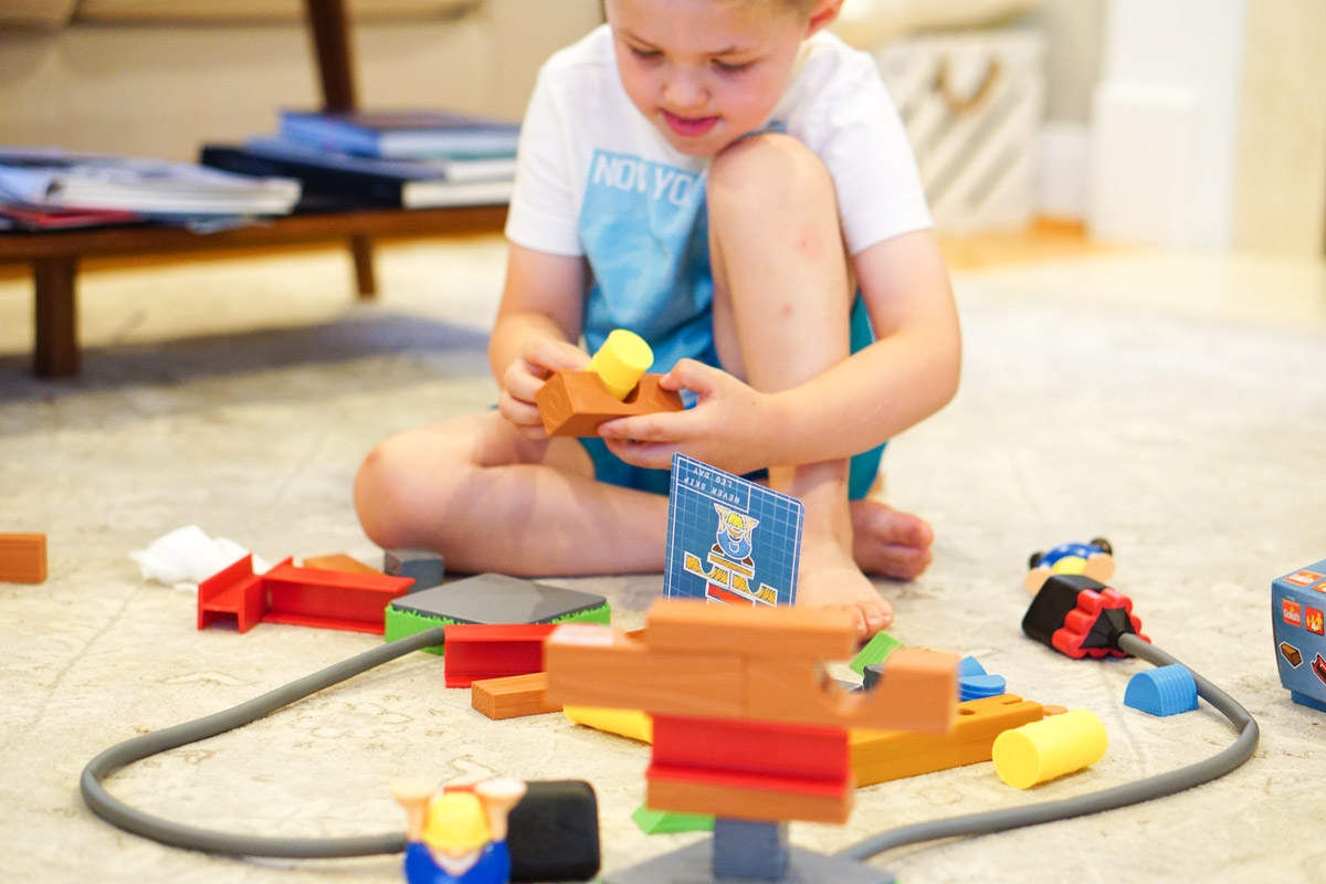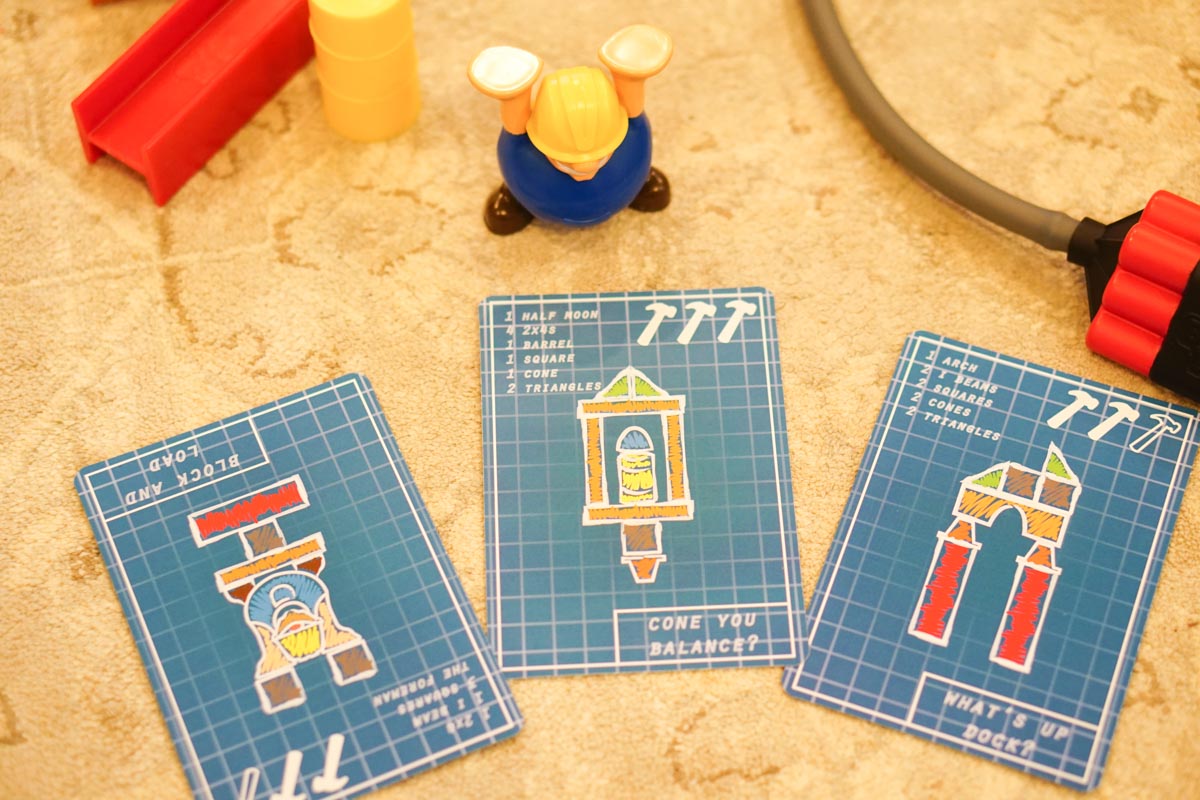 The structures are shown on blueprint cards and simple enough for little kids to recreate. And it’s super fun to get to squeeze the dynamite and smash your opponent’s tower.