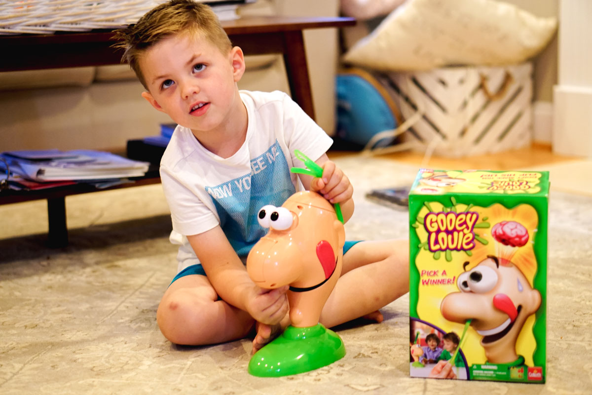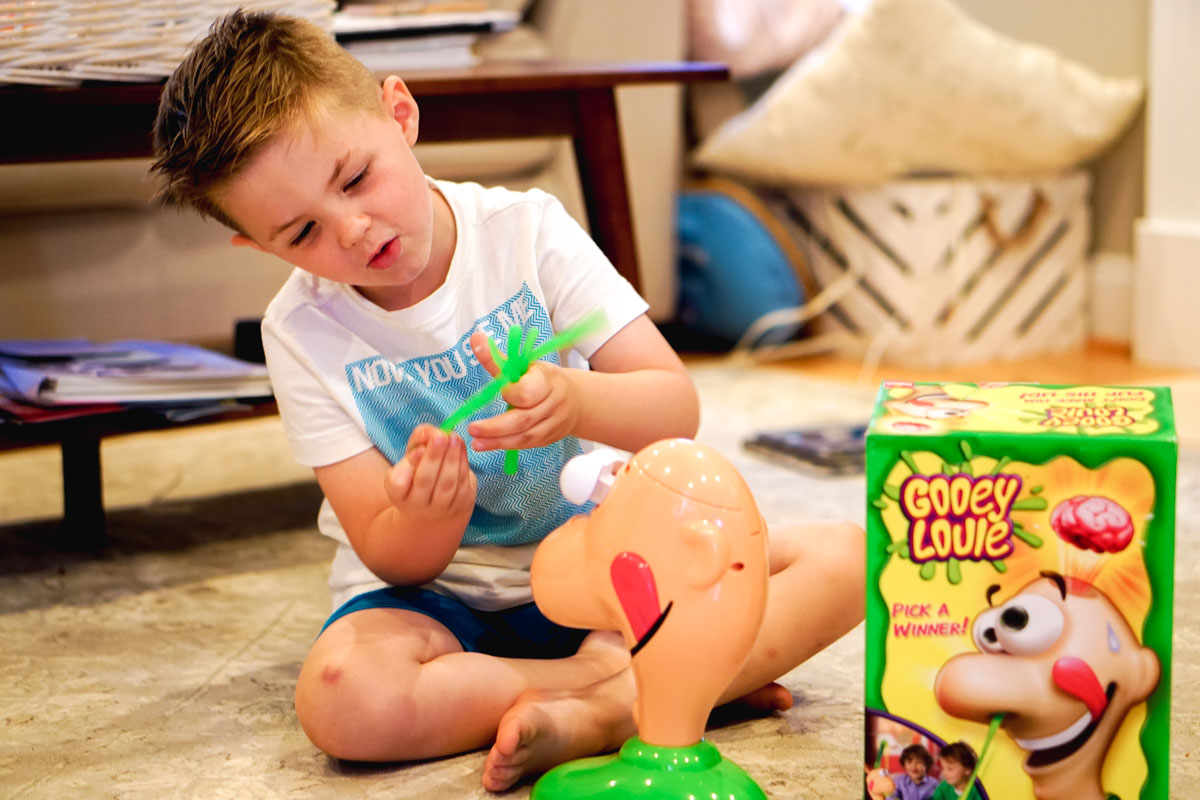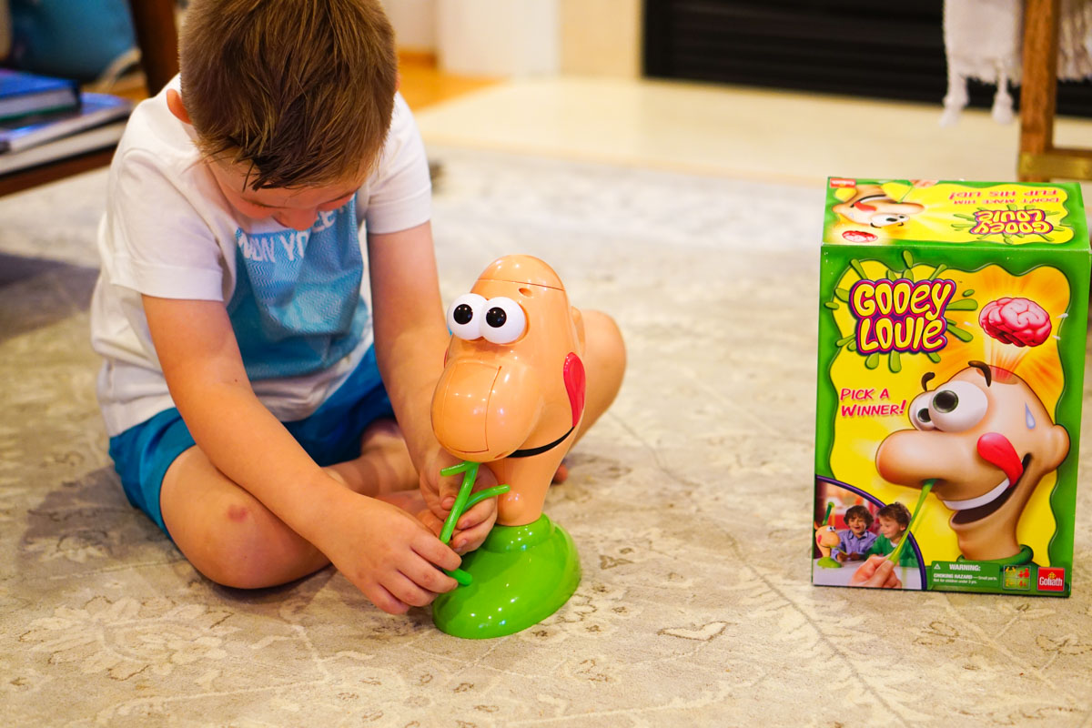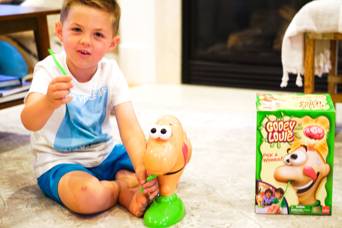 Another game that falls in the yucky yet fantastically fun category is Gooey Louie. Take turns trying to pick a winner with Gooey Louie™ but watch out . . . if you pick the wrong one his eyes will pop and his brain will fly out. This game gets us all laughing, it’s definitely exciting to play. Not knowing if you’re the next to pull the booger that flips Louies lid keeps everyone on their toes.