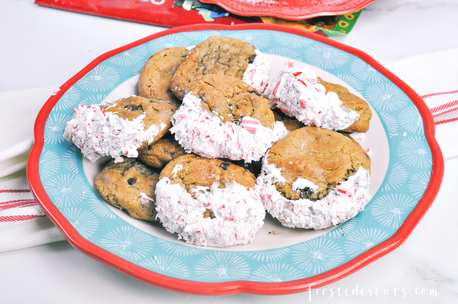 Dip the cookies in the melted chocolate (make sure it’s not too hot!) and then dip them in the crushed candy canes. Give them a few minutes to cool and your Chocolate Chip Candy Cane treats are all ready to eat.