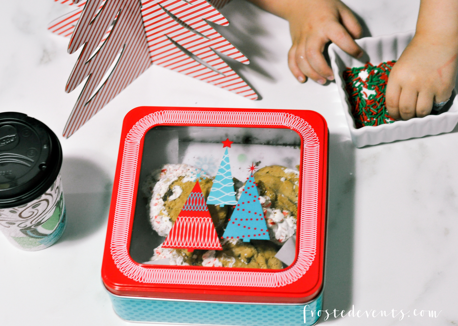 - Mom waits for cookies to cool while child opens sprinkles and dumps on floor