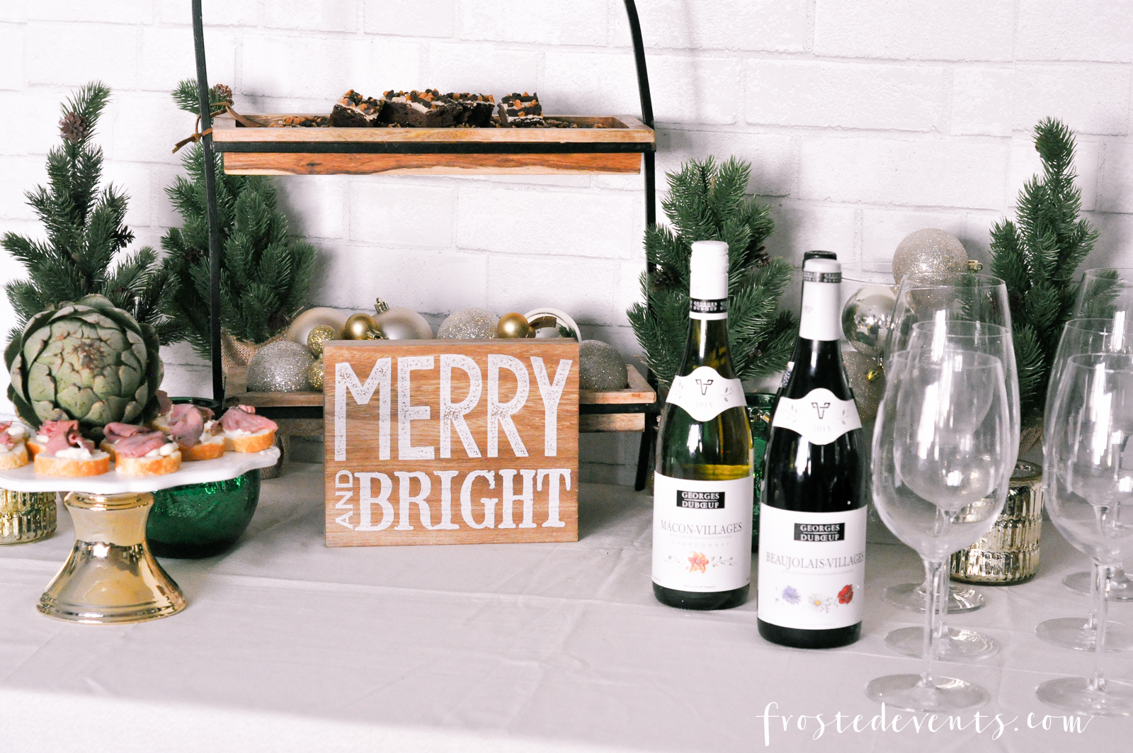 Holiday decorations for a cocktail party don’t have to be elaborate to make a great impression on your party guests. You want it to look easy and effortless,right? For this party I decided to stick with a neutral tablescape and bring in some gold and green to make it more festive. I found those small trees at Target, along with the Merry & Bright sign. I love the wood elements, gives it a little bit of a rustic look. I used my two-tier wooden buffet which made for a great centerpiece. You could also easily use a couple of small wooden crates stacked together. Gold ornaments add shimmer and shine to the table, and the wine glasses and wine bottles out fill in the empty spaces.