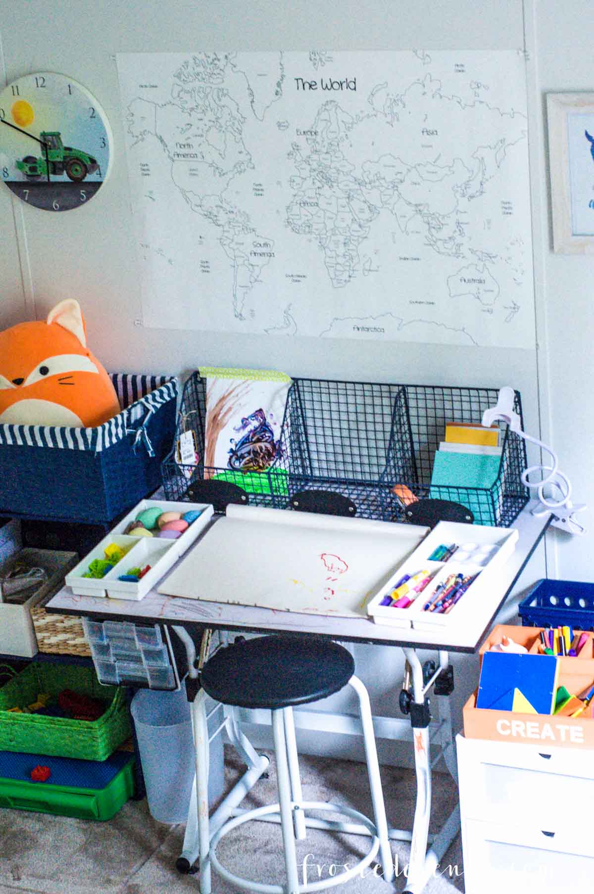 An art station to organize all his art supplies and a desk so he can draw, color and paint. I hung a map up beside this cute tractor clock so we can work on learning about all the places in the world.