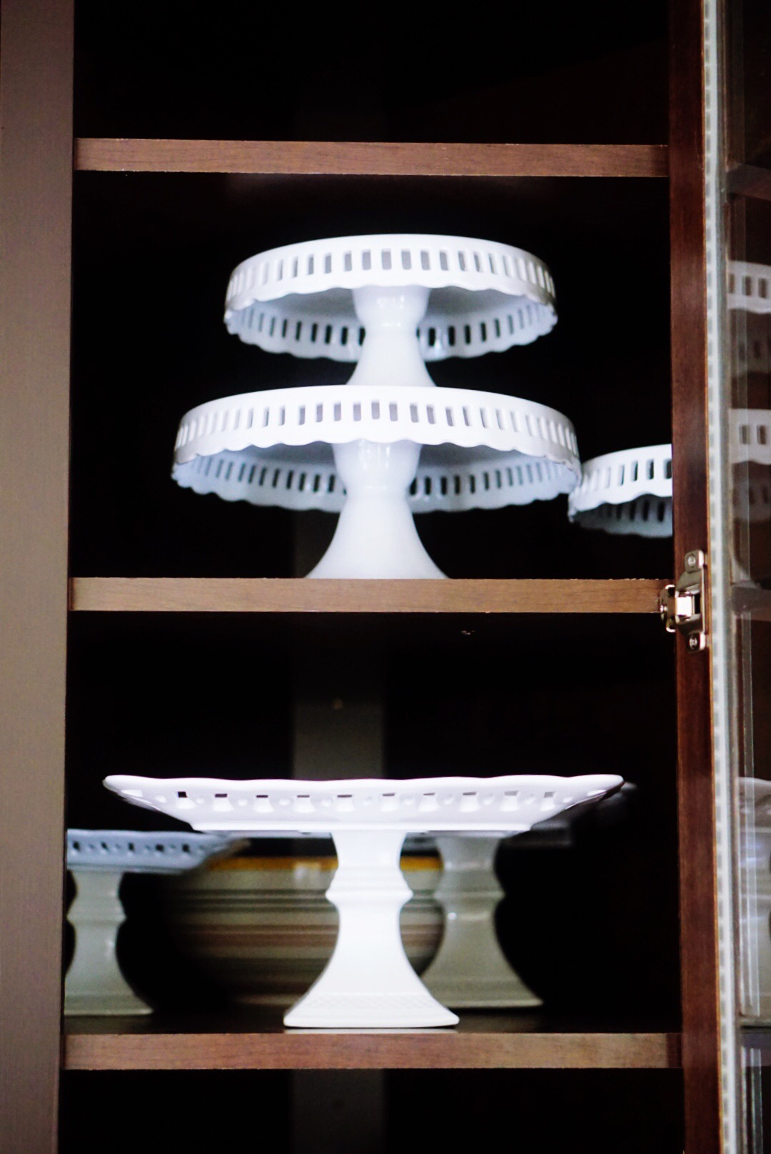 I love to play hostess and entertain at home. A good set of white serving platters will last you for years and make pulling together a party easy breezy. I’ve added to my collection over the years and have an assortment of cake stands and serving dishes in all sizes. For holidays, birthdays, baby showers and every other special occasion I pull them out of the cupboard and stick a post-it note on them to plan out how I’m going to arrange our spread. Plus, they look great stored on open cabinets or behind glass