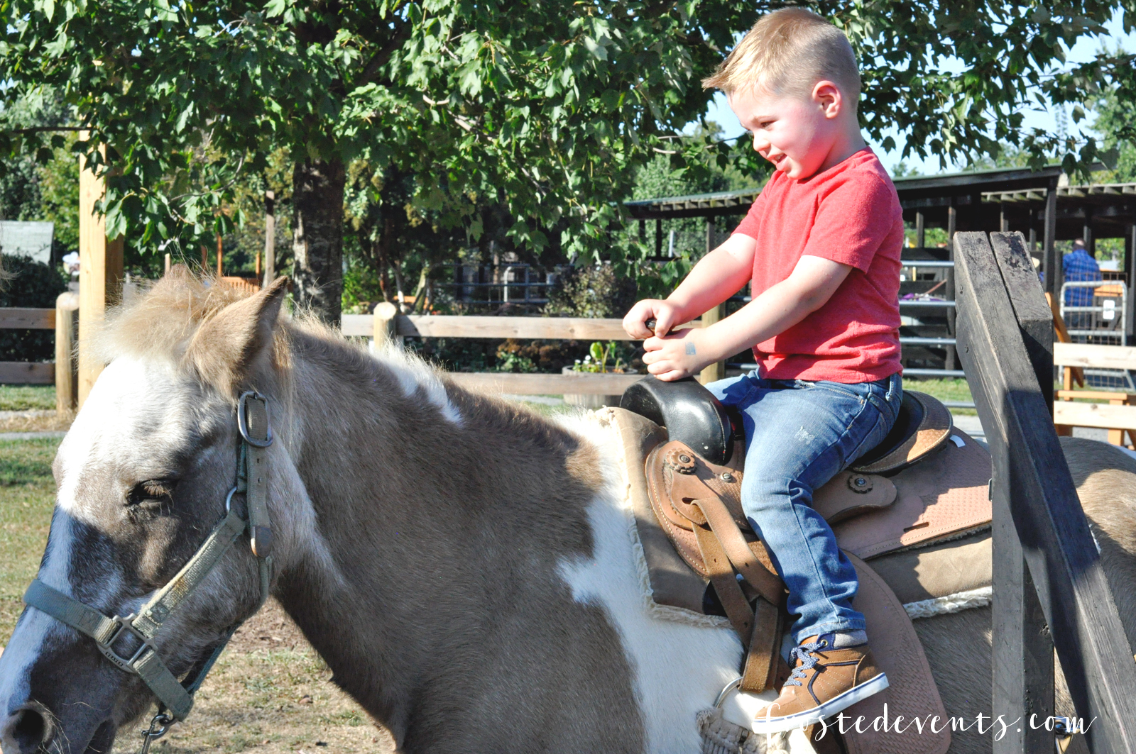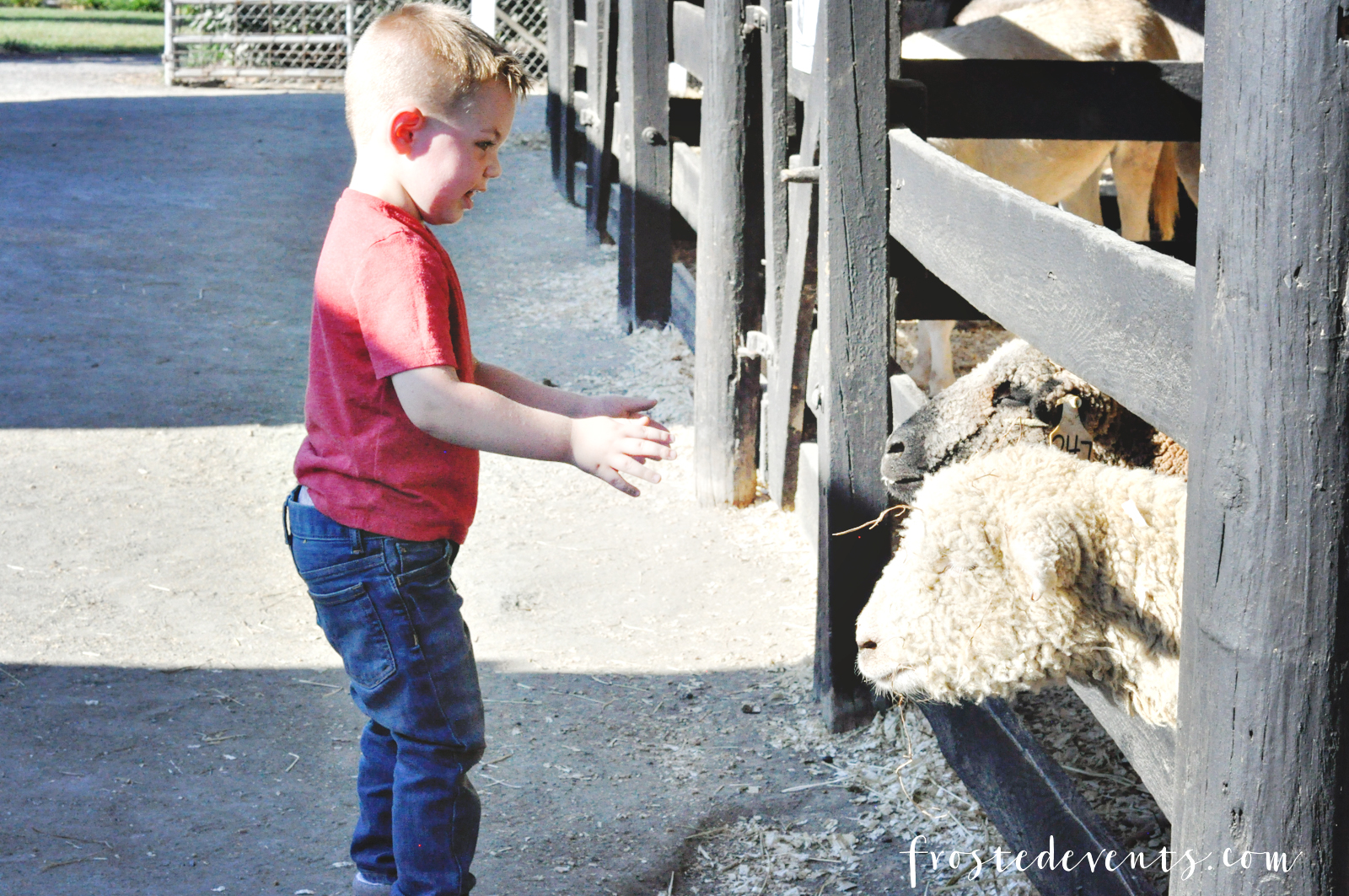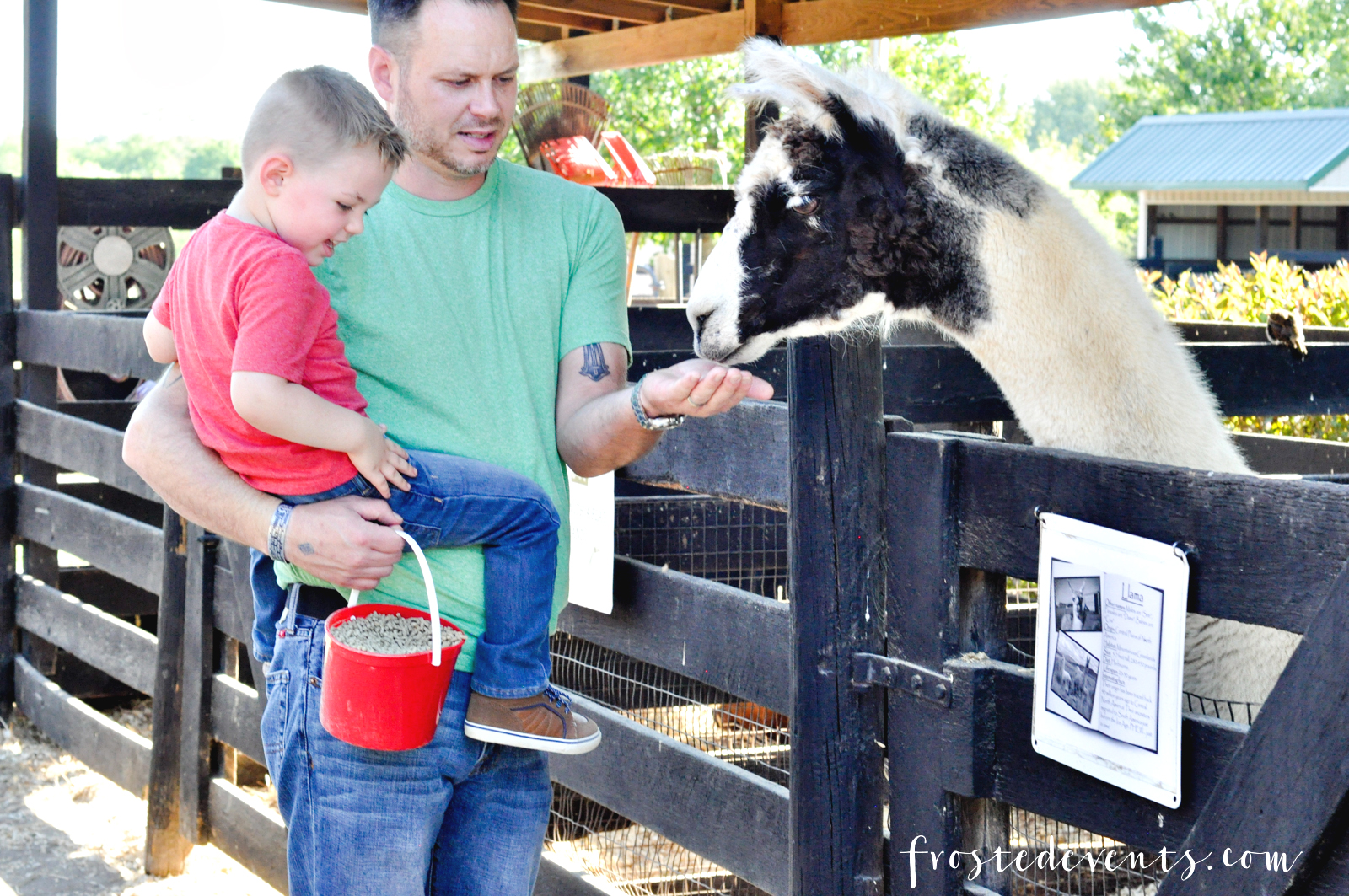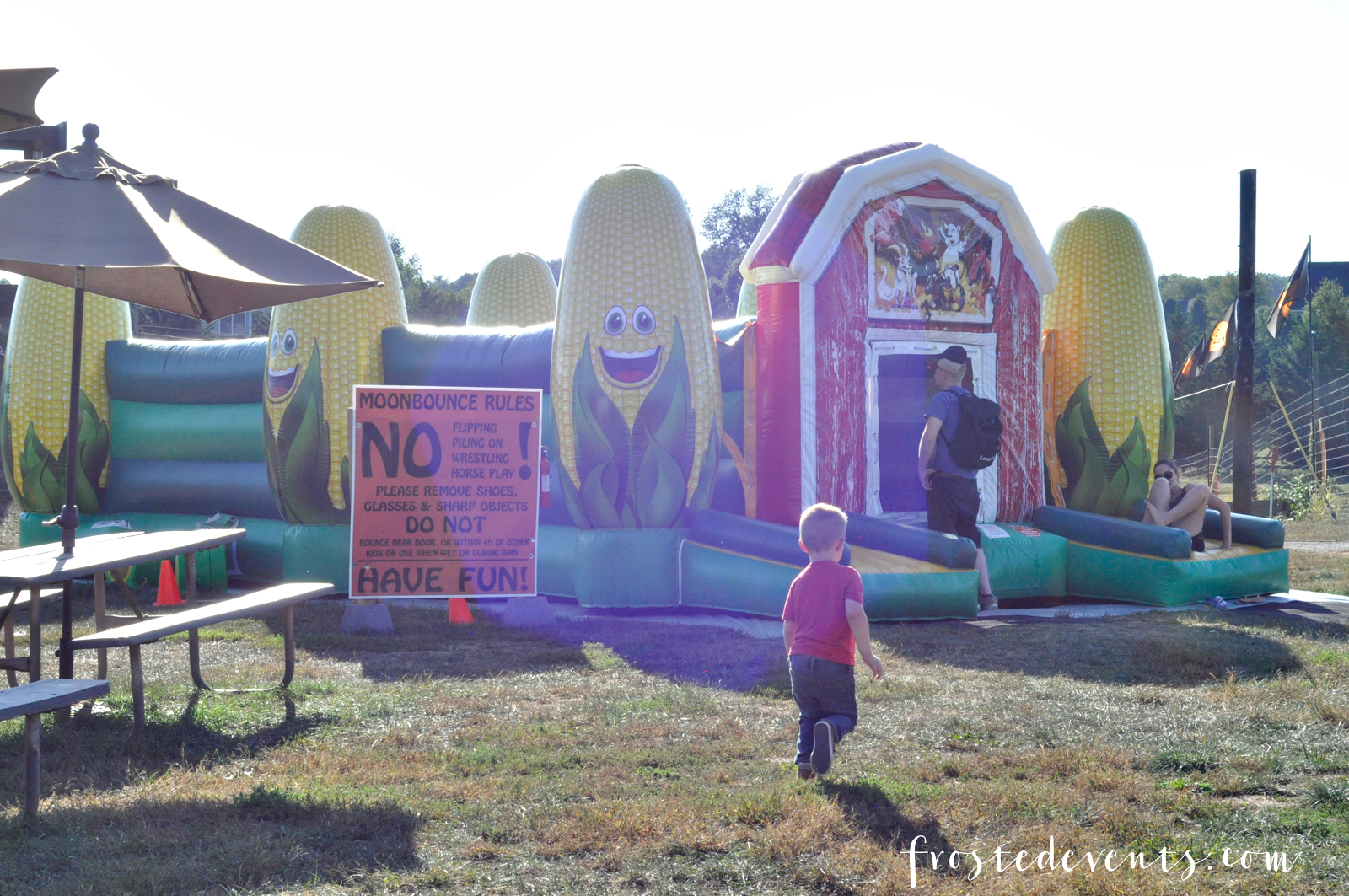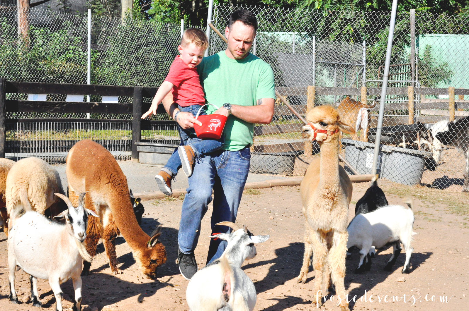 Walk out back and you’ll find a whole list of fun things for the kids to enjoy. Moon bounces, slides, animals, pedal cars, a lake, a maze and so much more. We started with the petting farm first. Brady LOVES animals so he was excited to see who was hanging out in the barn.
