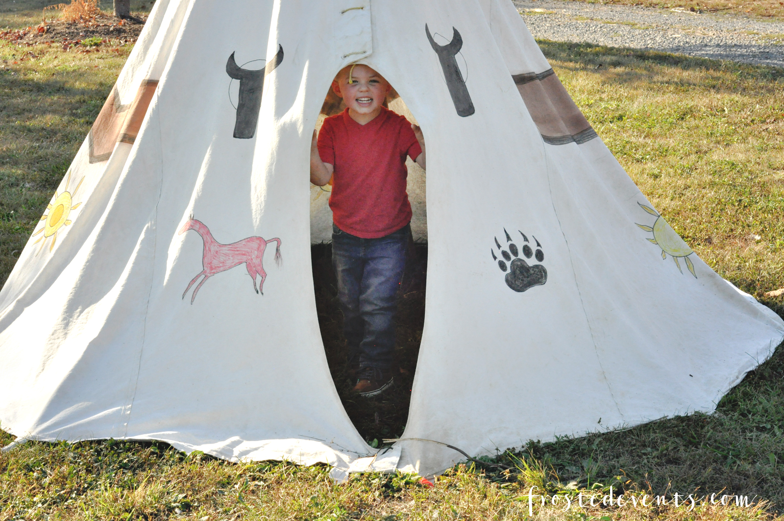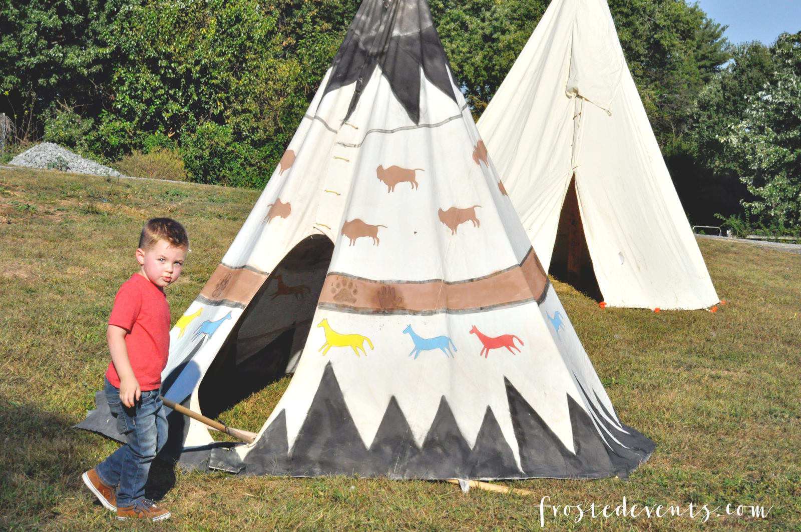 A cute tee-pee camp sits beside the lake for kids to explore, with a small fire pit. B ran in and out of each one and pretended to warm his hands over the campfire.