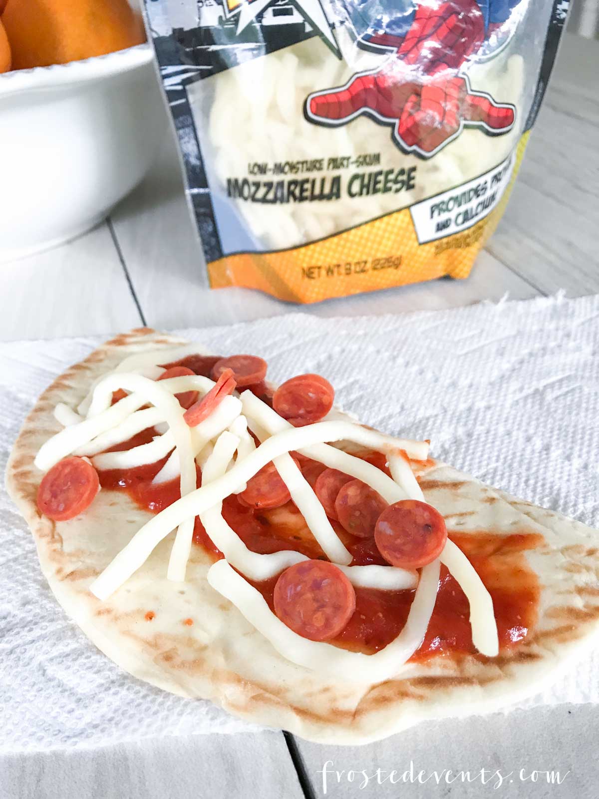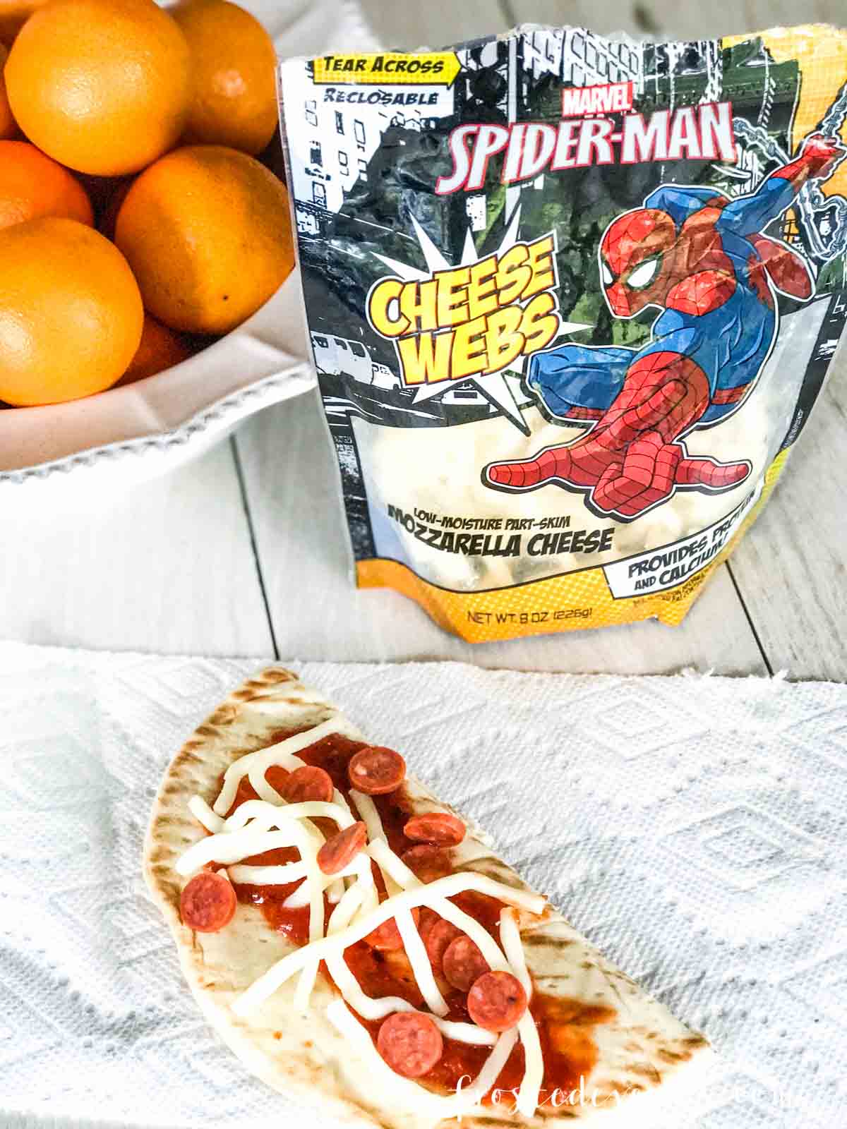 – Pepperoni Pizza + Oranges – flatbread, pepperonis, Marvel Spider-Man Webs Cheese, pizza sauce and orange