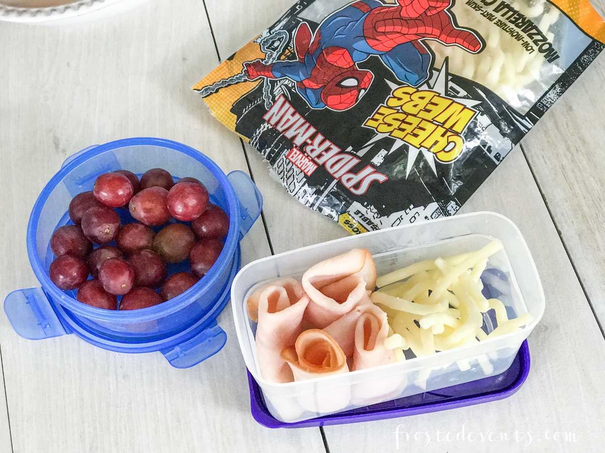 – Turkey Roll-Ups- turkey slices, Marvel Spider-Man Webs Cheese, crackers, grapes