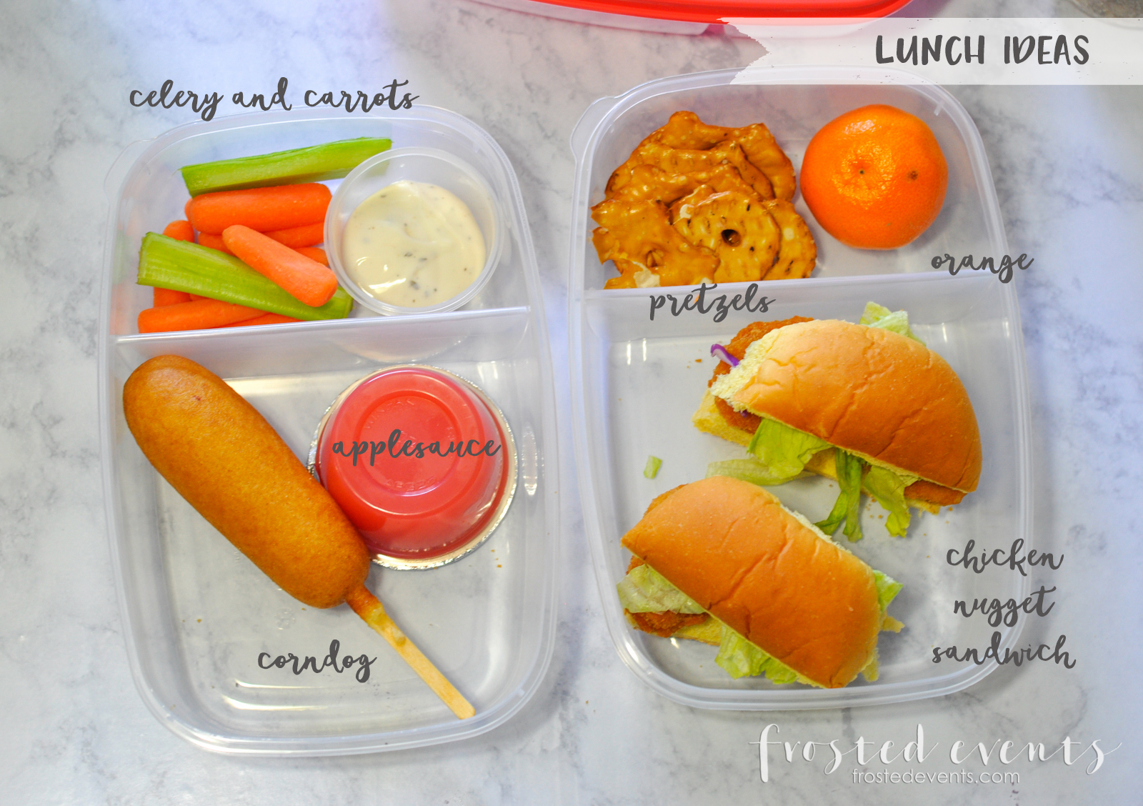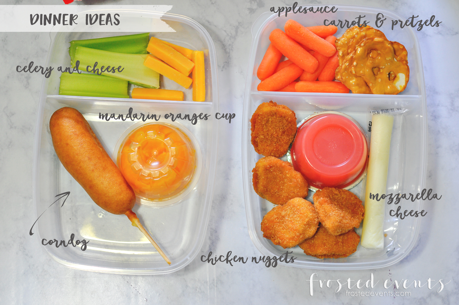 My go-to quick and convenient proteins for lunch and dinner are frozen chicken nuggets, corn dogs, meatballs and fish sticks. An applesauce cup, some pretzels, fruit and veggies make the meal complete.