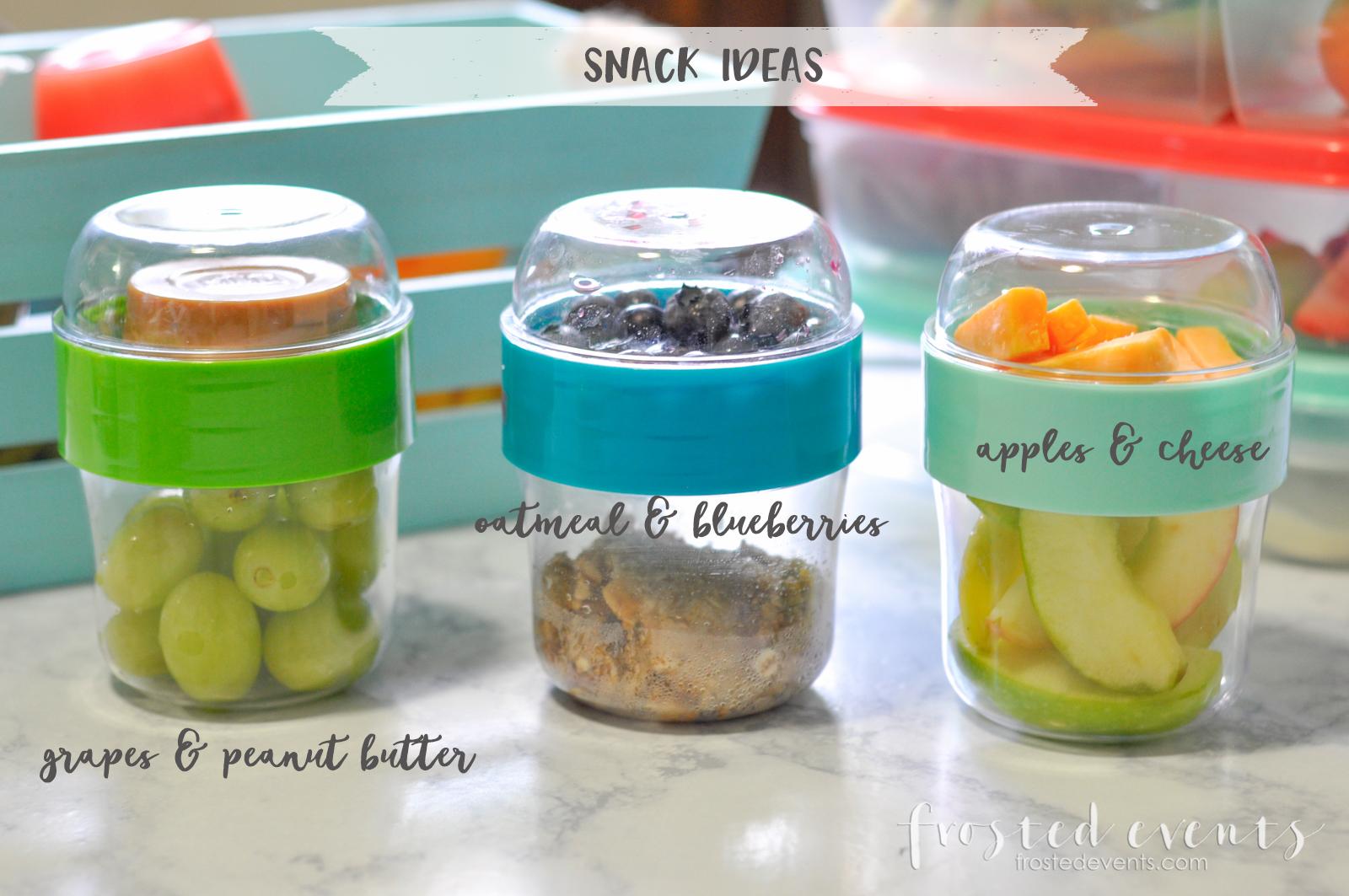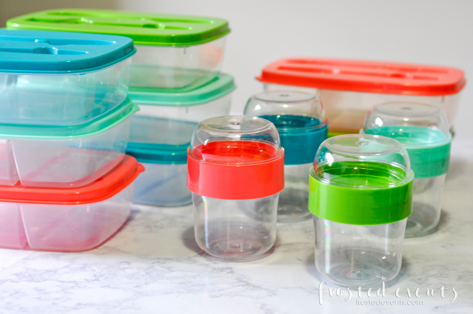 You’ll need a good set of food storage containers. I like ones that have divided compartments and and are easy to stack. I found these at Walmart, they’re inexpensive and dishwasher safe.