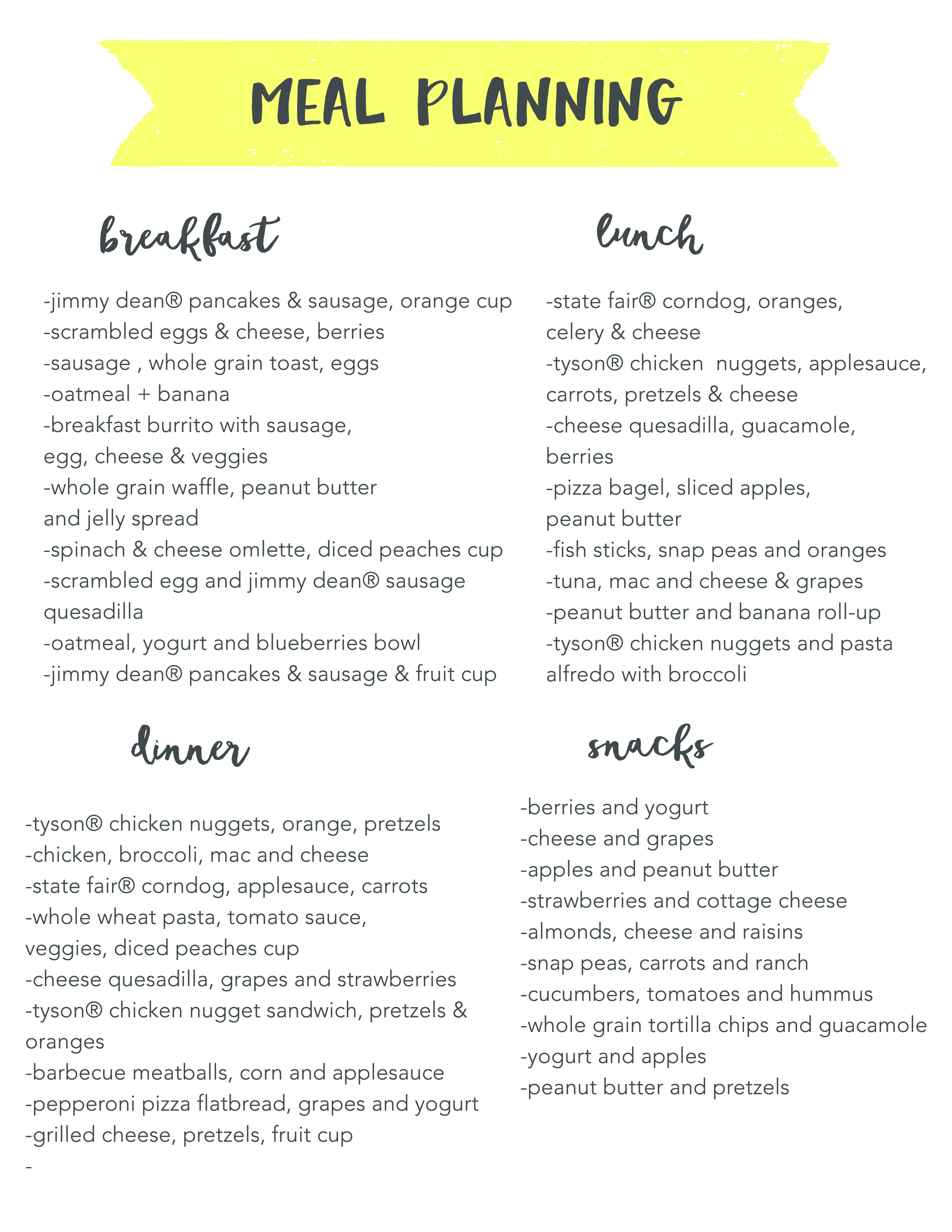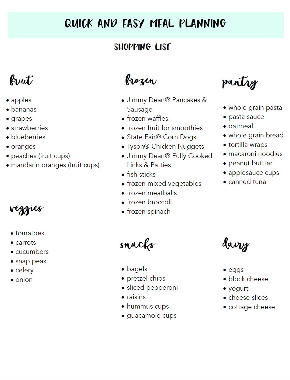 Meal planning starts with stocking up on foods and snacks your family will love. I fill up our fridge and freezer with quick and easy meals with one trip to Walmart. Here’s a rundown of my shopping list: