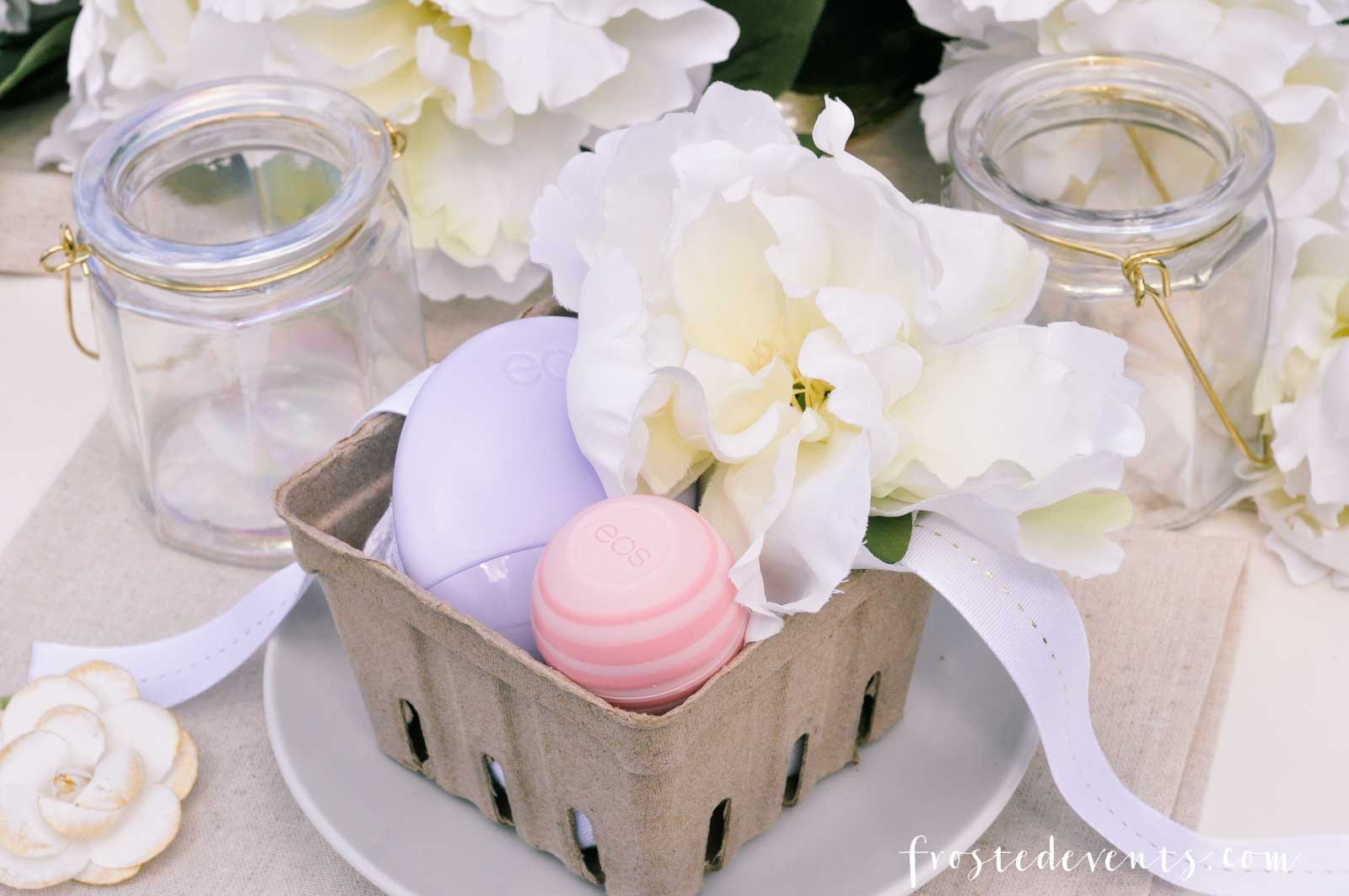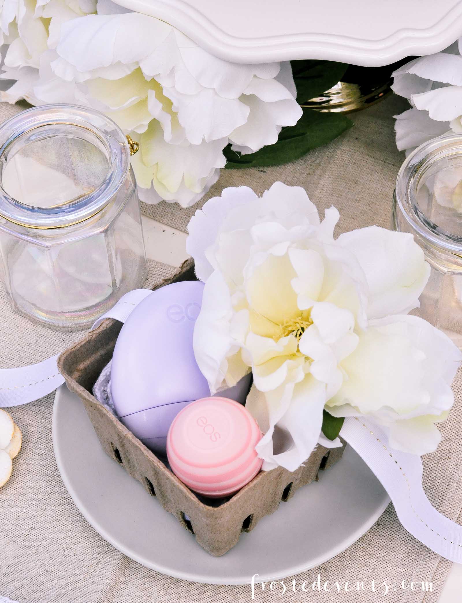 At each place setting I placed a berry basket with a few of my favorite things. I love eos beauty products so I included a lip balm and a hand lotion for each guest.These are from their new limited edition Spring packs. I’m obsessed with these lip balms, they are so soft and smell incredible. And the lotions are the perfect size for your purse, plus they are light and fast-absorbing.