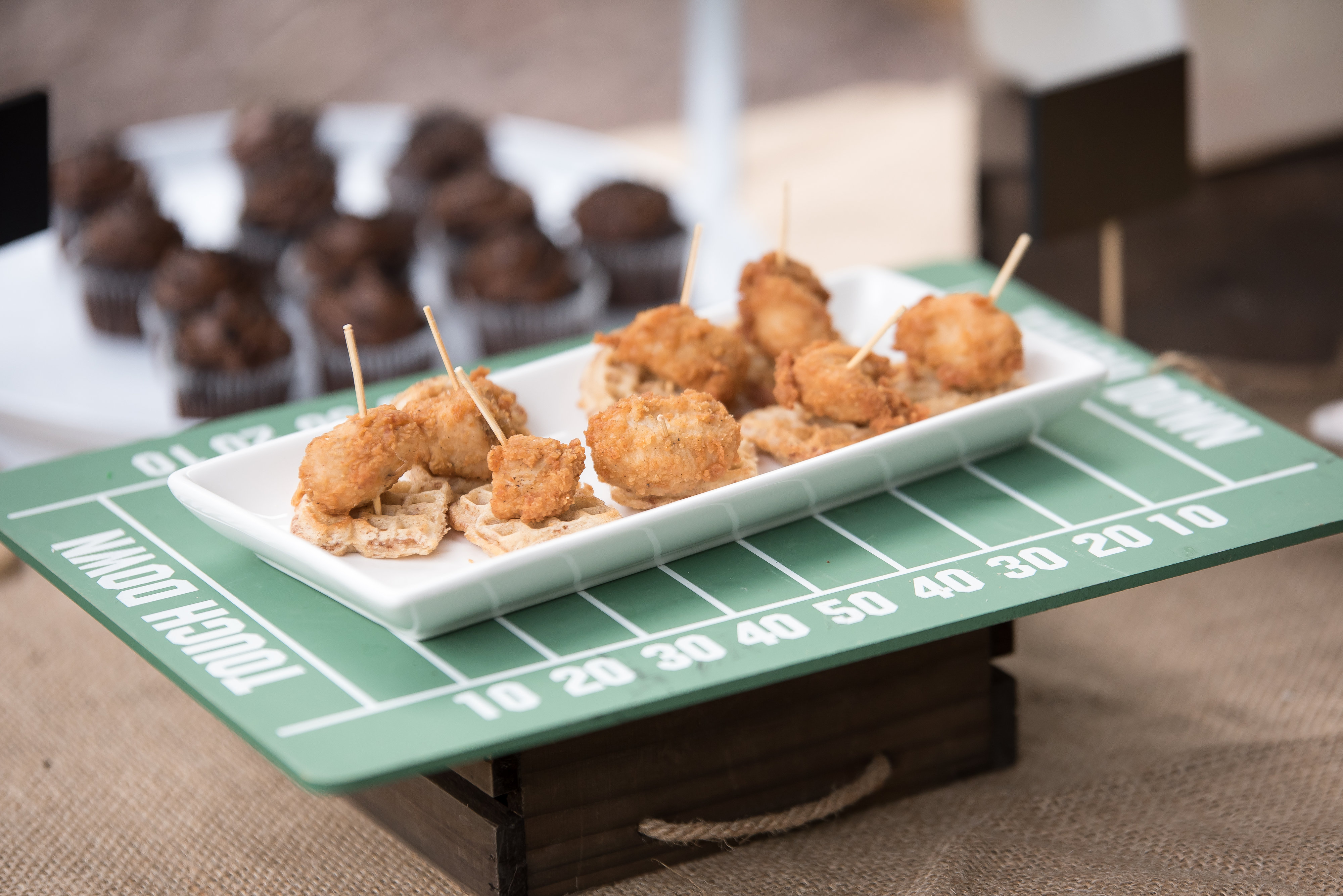 I made chicken and waffle bites, and these cute chocolate dipped strawberry footballs. They were both a big hit gave us a chance to nosh and mingle before we started making our draft selections.