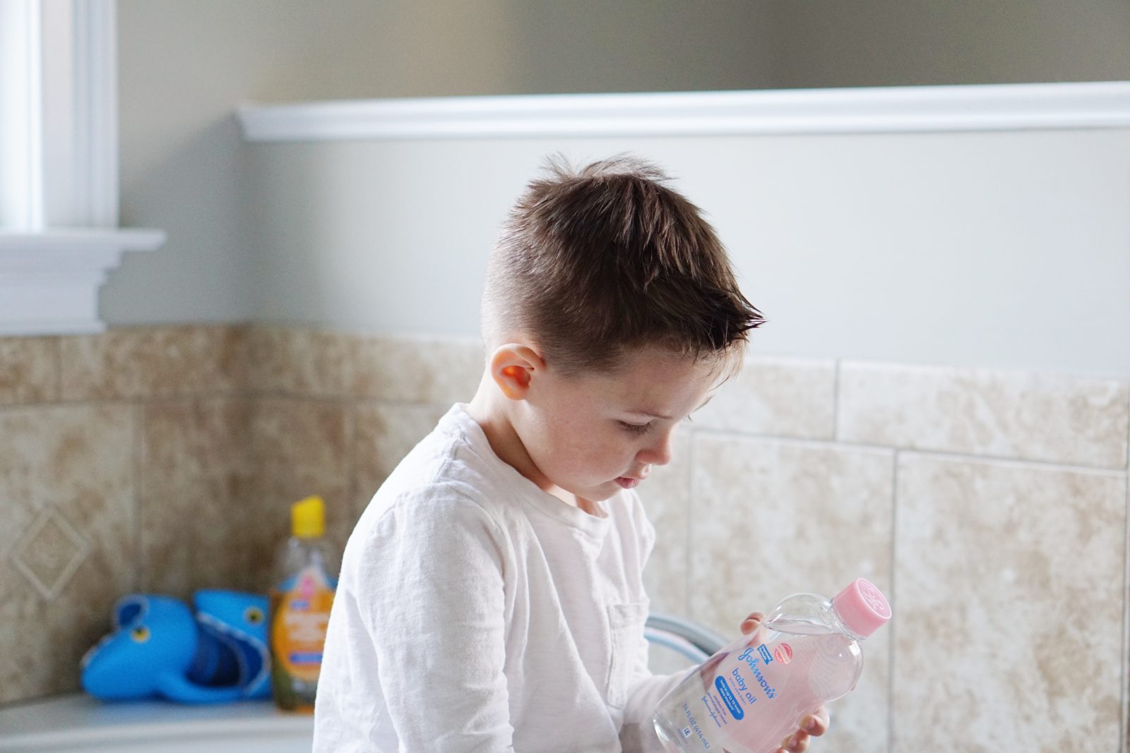 I use JOHNSON’S® Baby Oil on Brady and myself. It’s the best at moisturizing and keeping your skin soft. I rub it into his skin after a bath and it helps keep his skin from getting dry and rough.