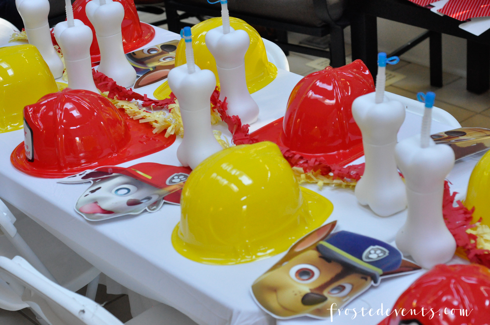 Paw Patrol Party Decorations — Kids table filled with fun. Paw Patrol masks, fire hats like Marshall, construction hard hats like Rubble, and fun bone shaped drinking cups. (see where to buy at bottom of page….)