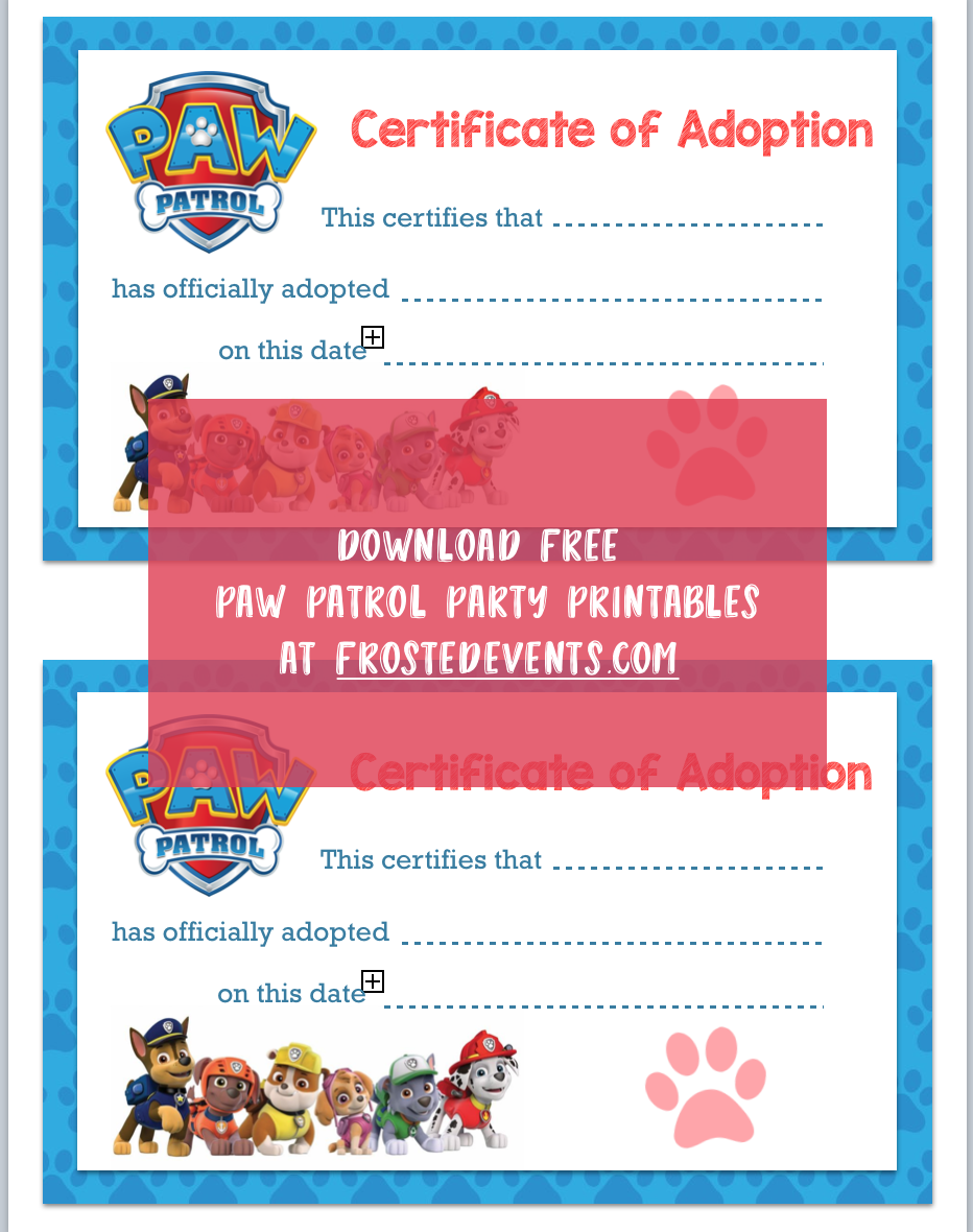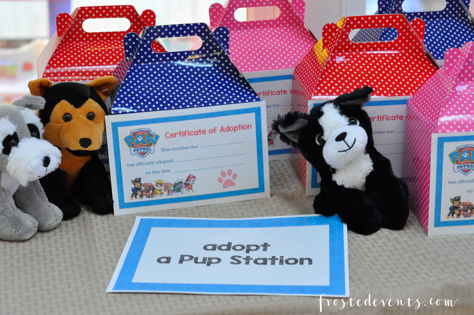 For party activity and as part of the party favor I set-up a puppy adoption table. The kids got to pick out their own puppy to take home, and each had a collar with a Paw Patrol charm that also could be used as a charm bracelet. I designed the Paw Patrol Adoption certificates, and you can download them for free. Links are listed below.