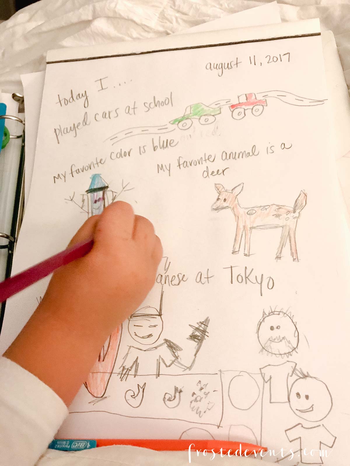 Another activity we introduced that he really loves is keeping a nighttime drawing journal. Every night before bed we talk about the things he did that day, write them down and sketch them out. He recalls his daily activities and I draw them out in stick figures. While he colors in my crude sketches, we talk about the events of the day and all the details he can remember. Not only does this help develop his memory skills, it’s a chance for us to discuss his feelings and encourage critical thinking as well. Outlining a day at the park, he works to recall the names of his new friends, to explain the differences and similarities he observes, and conceptualizes future events and imaginary ideas. “I met a boy named Colin. He had a big, furry dog! If I had a dog I would name him Monster and he could pull my bicycle down the street all the way to school.”