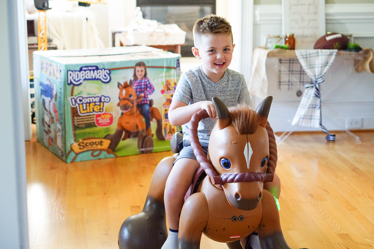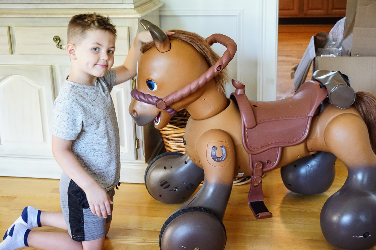 Remember when we went to that big toy event in NYC where we got a sneak peek at all the new toys that will be hot this holiday season? Well, one of the most popular toys at that event, one of the kid’s absolute favorite things, showed up on our doorstep! Thank you to our friends at KidTrax for sending Scout, the pony Rideamal for us to play with and share our thoughts. All opinions are our own….
