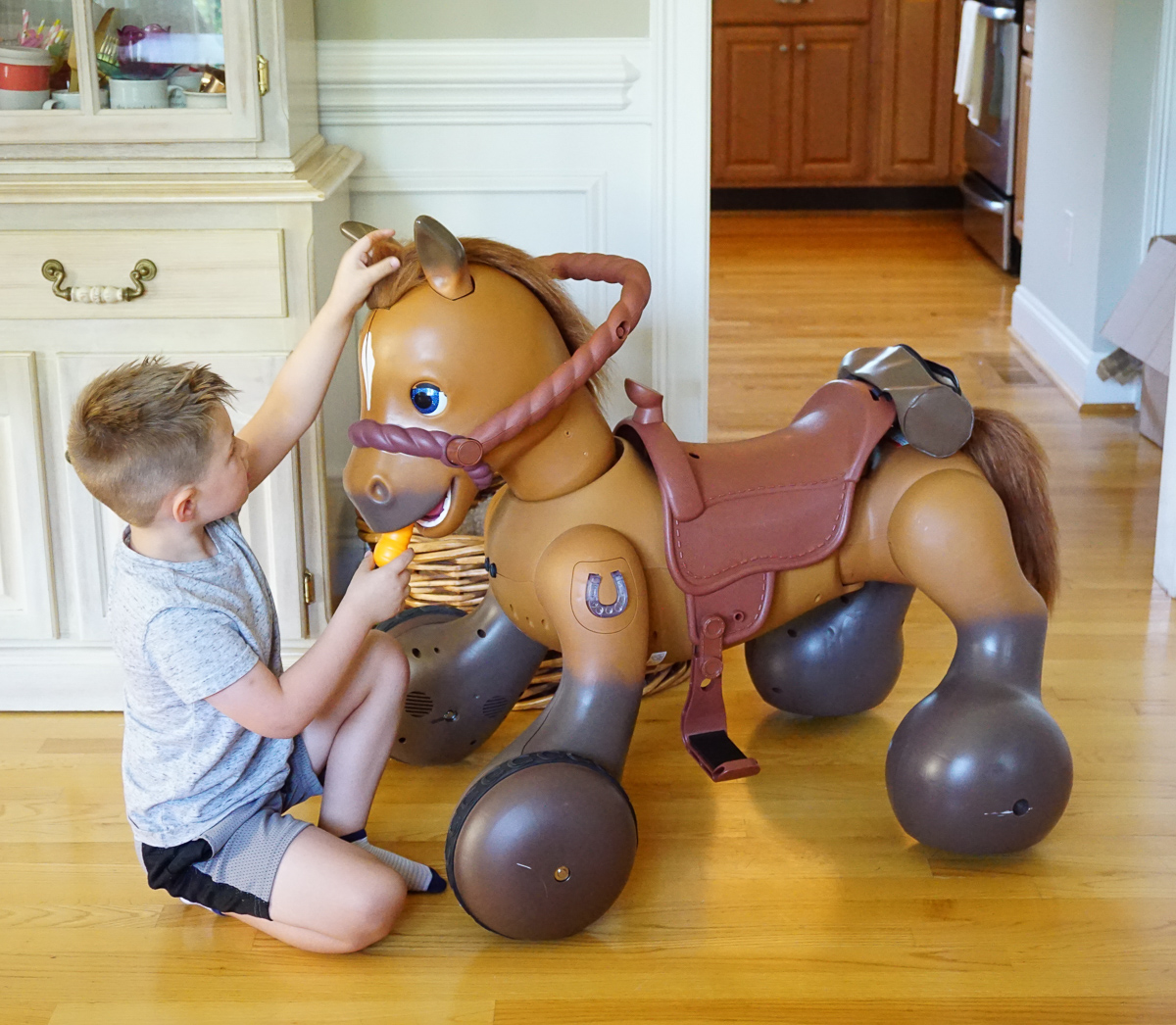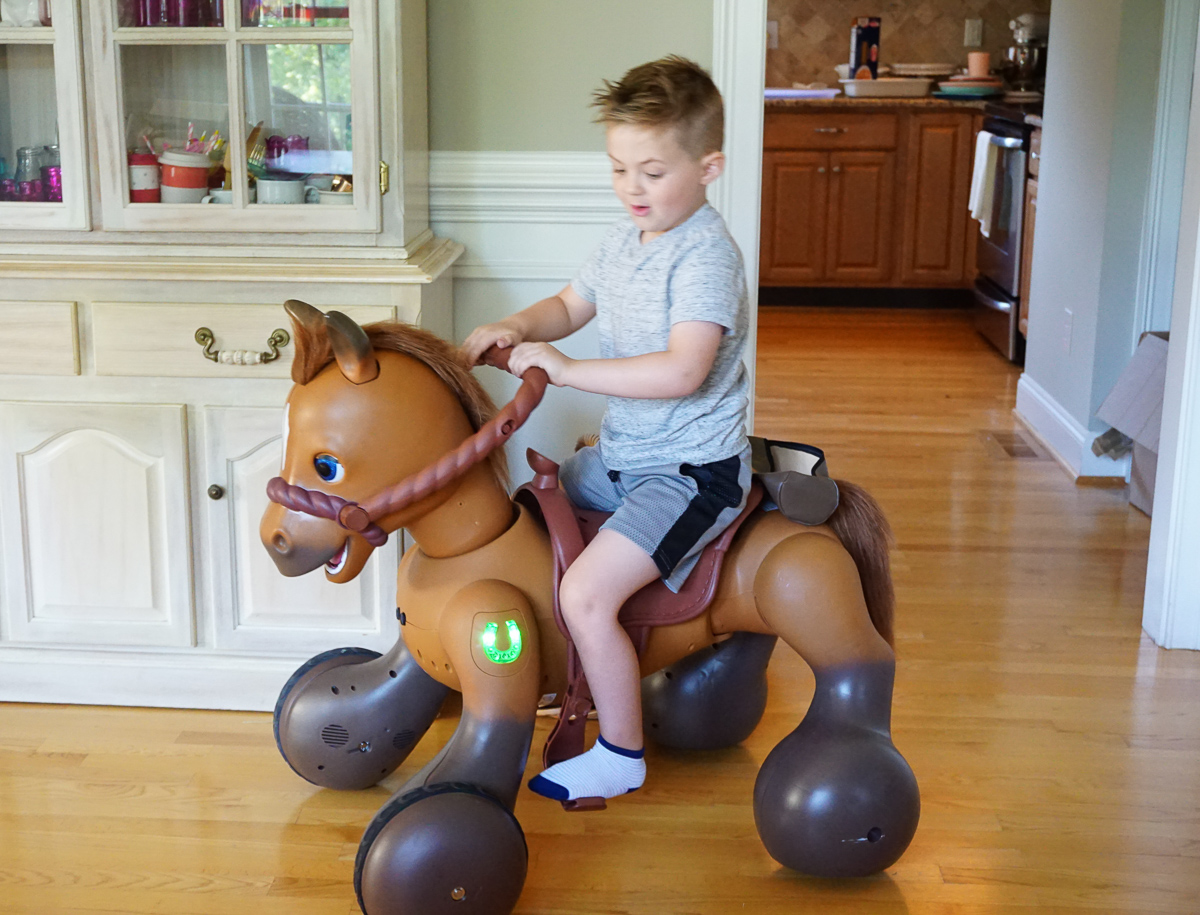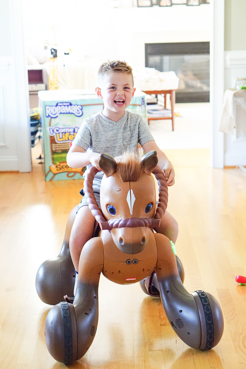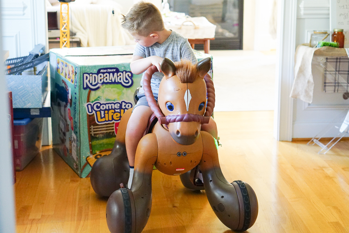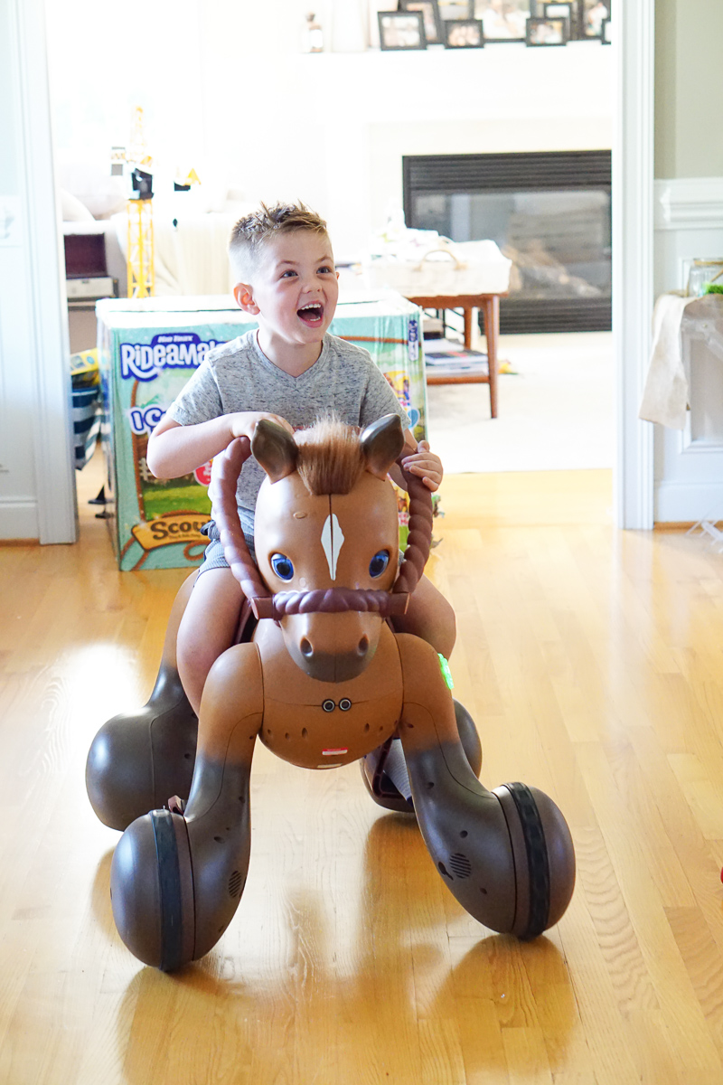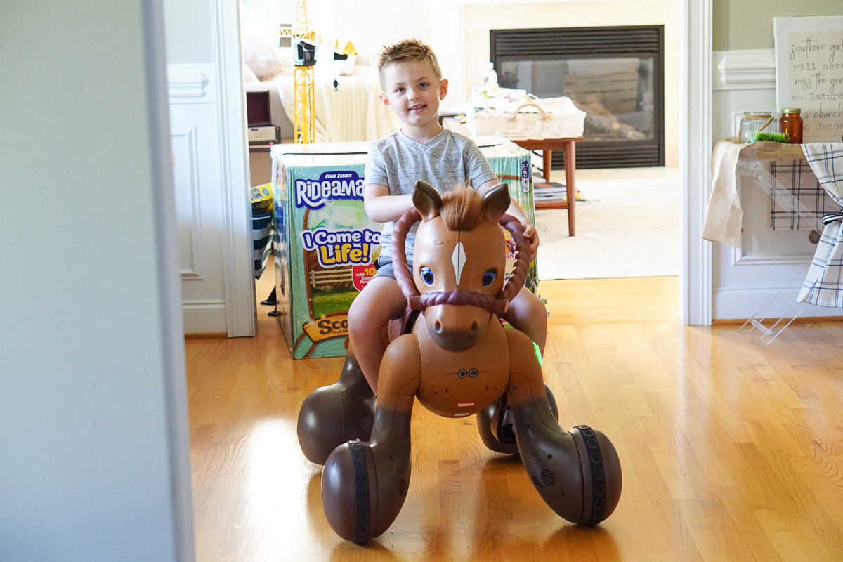 Brady could play with this pony for hours and be blissfully happy! He loves taking it for laps around the house. He quickly got the hang of how to steer and control it and he can easily go forward and reverse. We’re excited to host a western themed play date and invite our friends over to take them for a ride!
