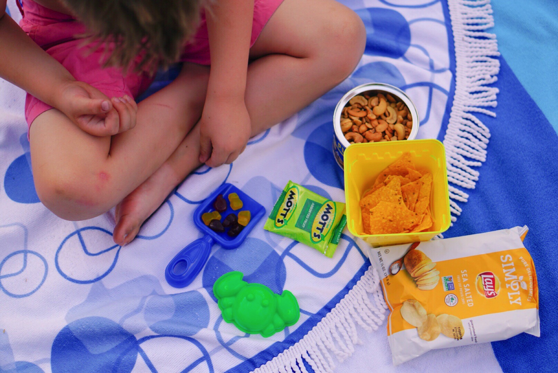 Here’s a fun idea my son loves for how to set-up an awesome beach picnic. I pick up some inexpensive sand toys and use those to set out our snacks. Fill up a beach pail with chips, use small sand toys as mini serving plates and bowls for food. The kids love to nibble on their snacks and then use the toys to play in the sand.