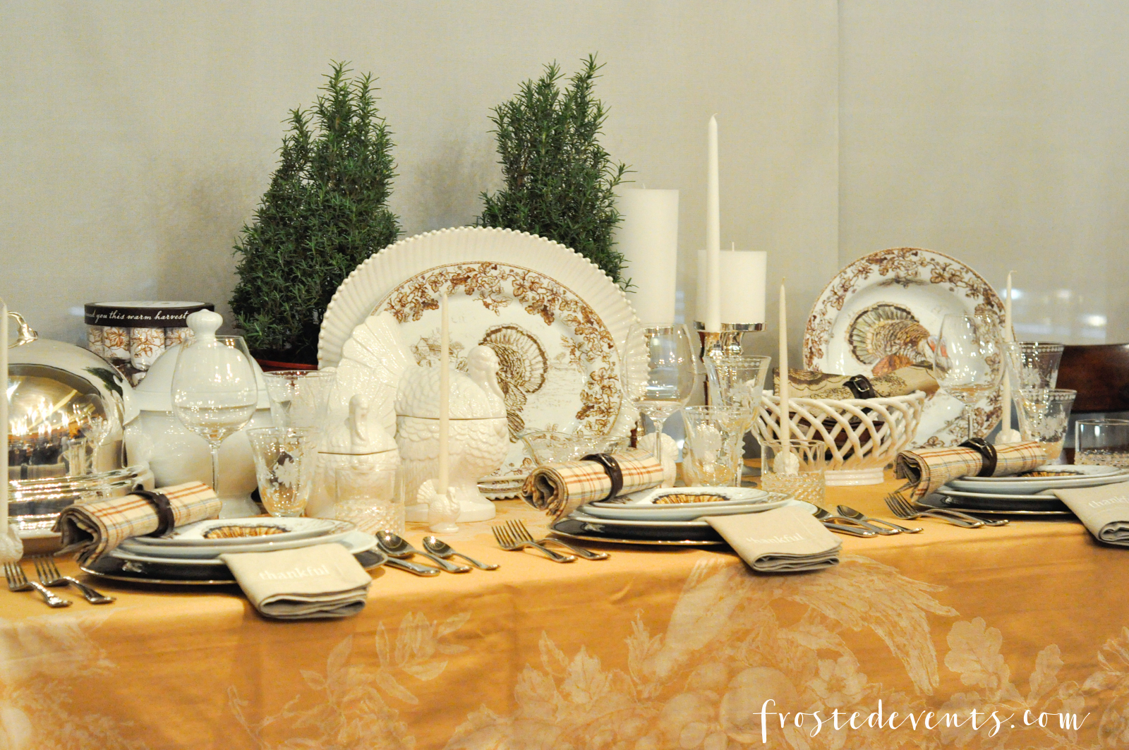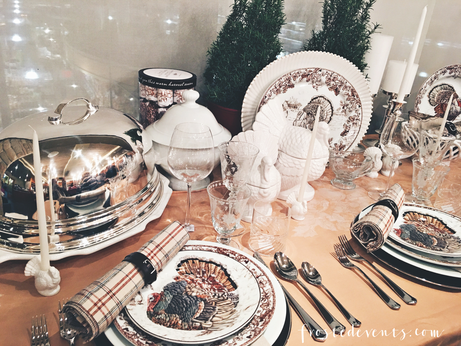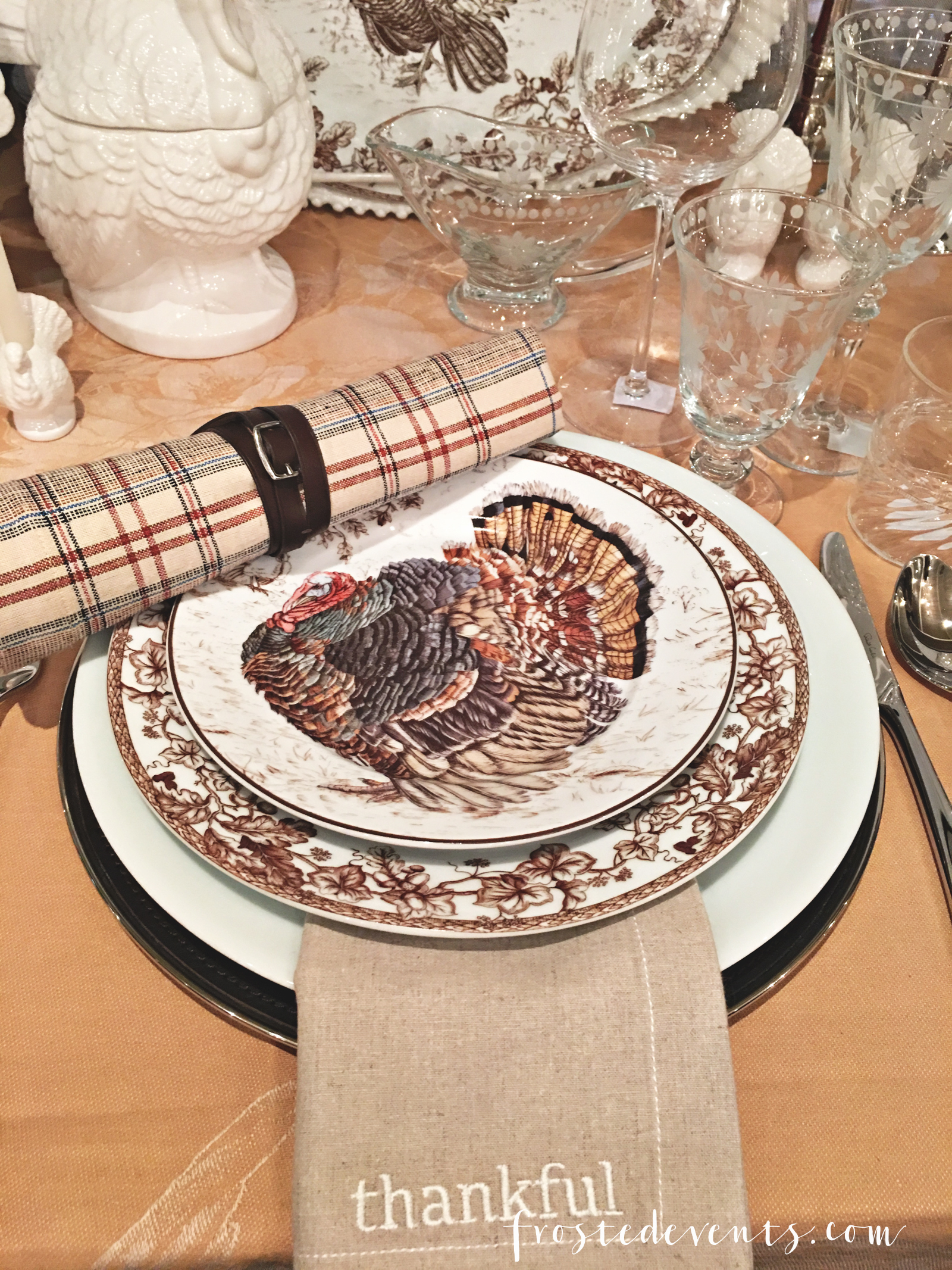 Now that you know where to pick up your holiday dinner, let’s talk about decorating the table. I’m so in love with this tablescape from Williams-Sonoma, from the Plymouth turkey platter to the vintage etched gravy boat. I want it all! These are the kind of pieces you collect and pass down for your children to treasure during the holidays. So many thoughtful details make this table shine. The plaid napkins wrapped with leather buckle napkin rings, the etched glasses and goblets and the white ceramic turkey tureen.